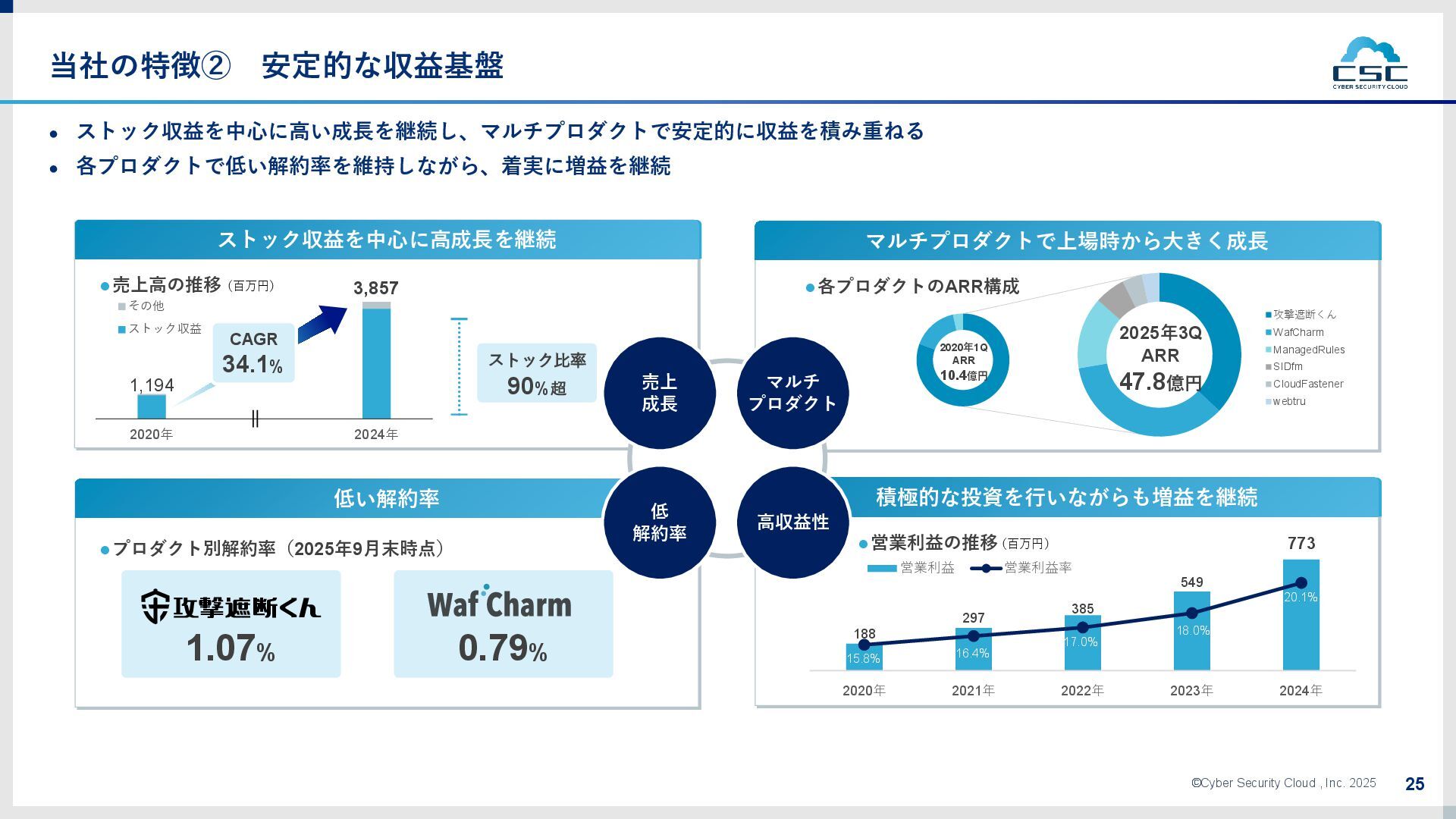 ⚫各プロダクトのARR構成 当社の特徴② 安定的な収益基盤 • ストック収益を中心に高い成長を継続し、マルチプロダクトで安定的に収益を積み重ねる • 各プロダクトで低い解約率を維持しながら、着実に増益を継続 ストック収益を中心に高成長を継続 低い解約率 1,194 3,857 2020年 2024年 その他 ストック収益 ⚫売上高の推移 ⚫プロダクト別解約率(2025年9月末時点) 高収益性 低 解約率 ストック比率 90%超 (百万円) 1.07% 0.79% 188 297 385 549 773 15.8% 16.4% 17.0% 18.0% 20.1% 2020年 2021年 2022年 2023年 2024年 営業利益 営業利益率 ⚫営業利益の推移 売上 成長 マルチ プロダクト 2020年1Q ARR 10.4億円 攻撃遮断くん WafCharm ManagedRules SIDfm CloudFastener webtru 2025年3Q ARR 47.8億円 CAGR 34.1%