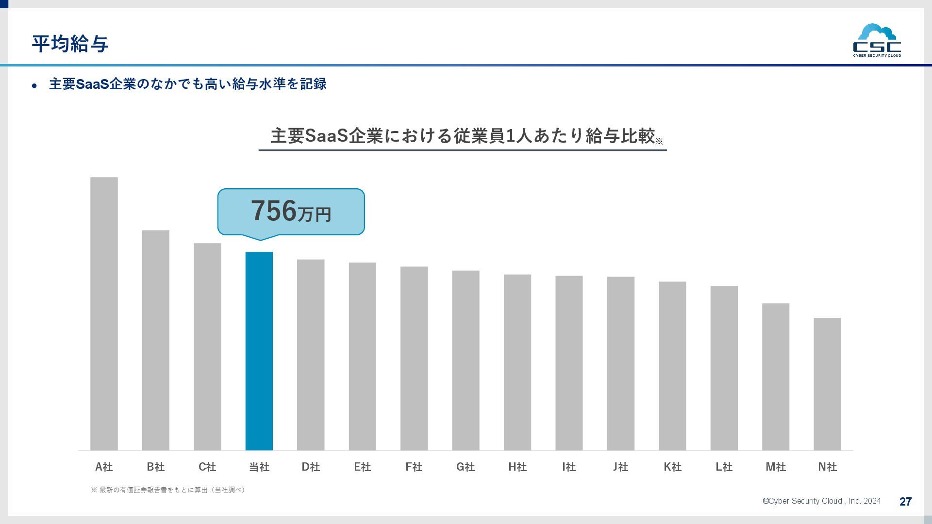 当社 D社 E社 F社 G社 H社 I社 J社 K社 L社 M社 N社 平均給与 主要SaaS企業における従業員1人あたり給与比較 ※ ※ 最新の有価証券報告書をもとに算出(当社調べ) 756万円 • 主要SaaS企業のなかでも高い給与水準を記録