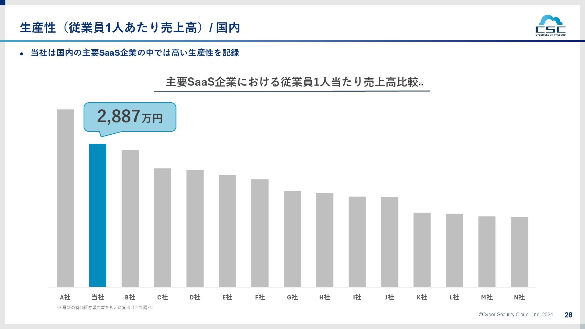 C社 D社 E社 F社 G社 H社 I社 J社 K社 L社 M社 N社 生産性(従業員1人あたり売上高)/ 国内 主要SaaS企業における従業員1人当たり売上高比較※ 2,887万円 ※ 最新の有価証券報告書をもとに算出(当社調べ) • 当社は国内の主要SaaS企業の中では高い生産性を記録