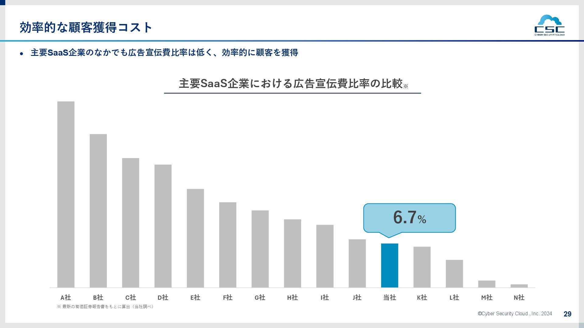 24. 29 ©Cyber Security Cloud , Inc. 2024 効率的な顧客獲得コスト 主要SaaS企業における広告宣伝費比率の比較 ※