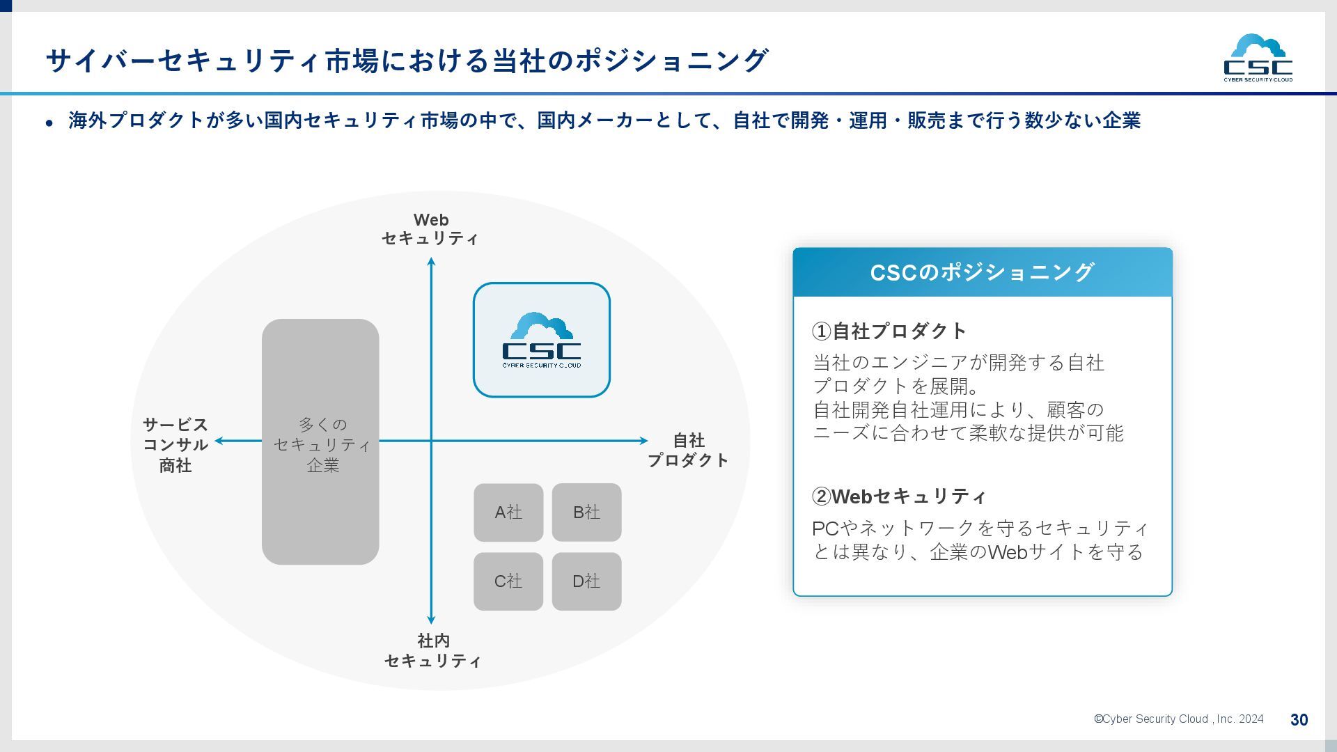 25. 30 ©Cyber Security Cloud , Inc. 2024 サイバーセキュリティ市場における当社のポジショニング • 海外プロダクトが多い国内セキュリティ市場の中で、国内メーカーとして、自社で開発・運用・販売まで行う数少ない企業