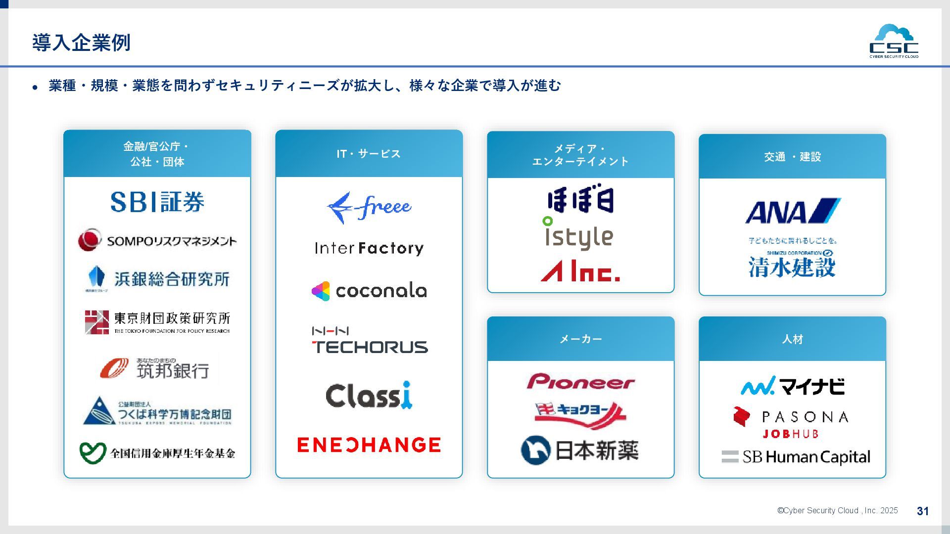 26. 31 ©Cyber Security Cloud , Inc. 2025 導入企業例 • 業種・規模・業態を問わずセキュリティニーズが拡大し、様々な企業で導入が進む