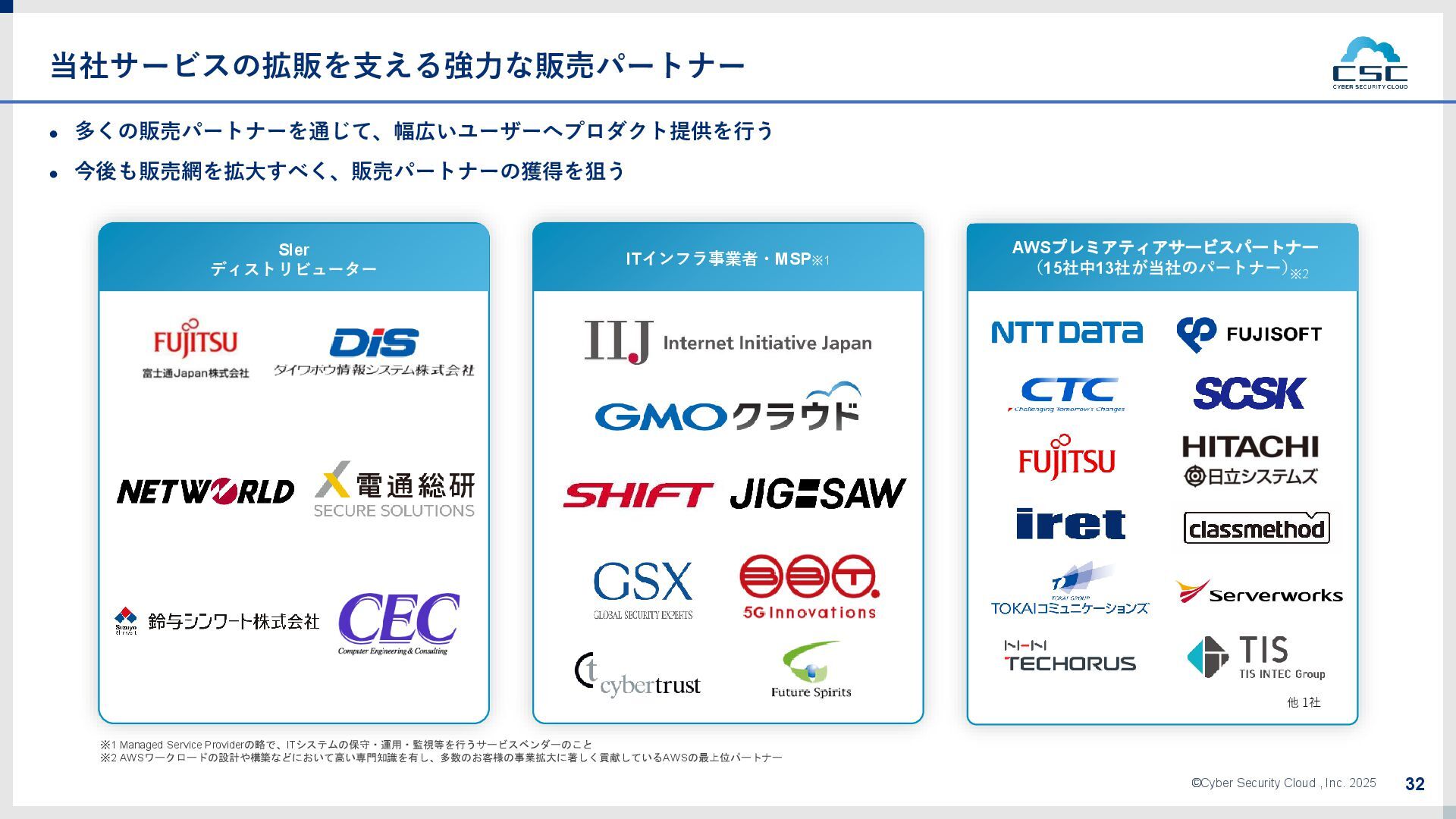 27. 32 ©Cyber Security Cloud , Inc. 2025 当社サービスの拡販を支える強力な販売パートナー • 多くの販売パートナーを通じて、幅広いユーザーへプロダクト提供を行う