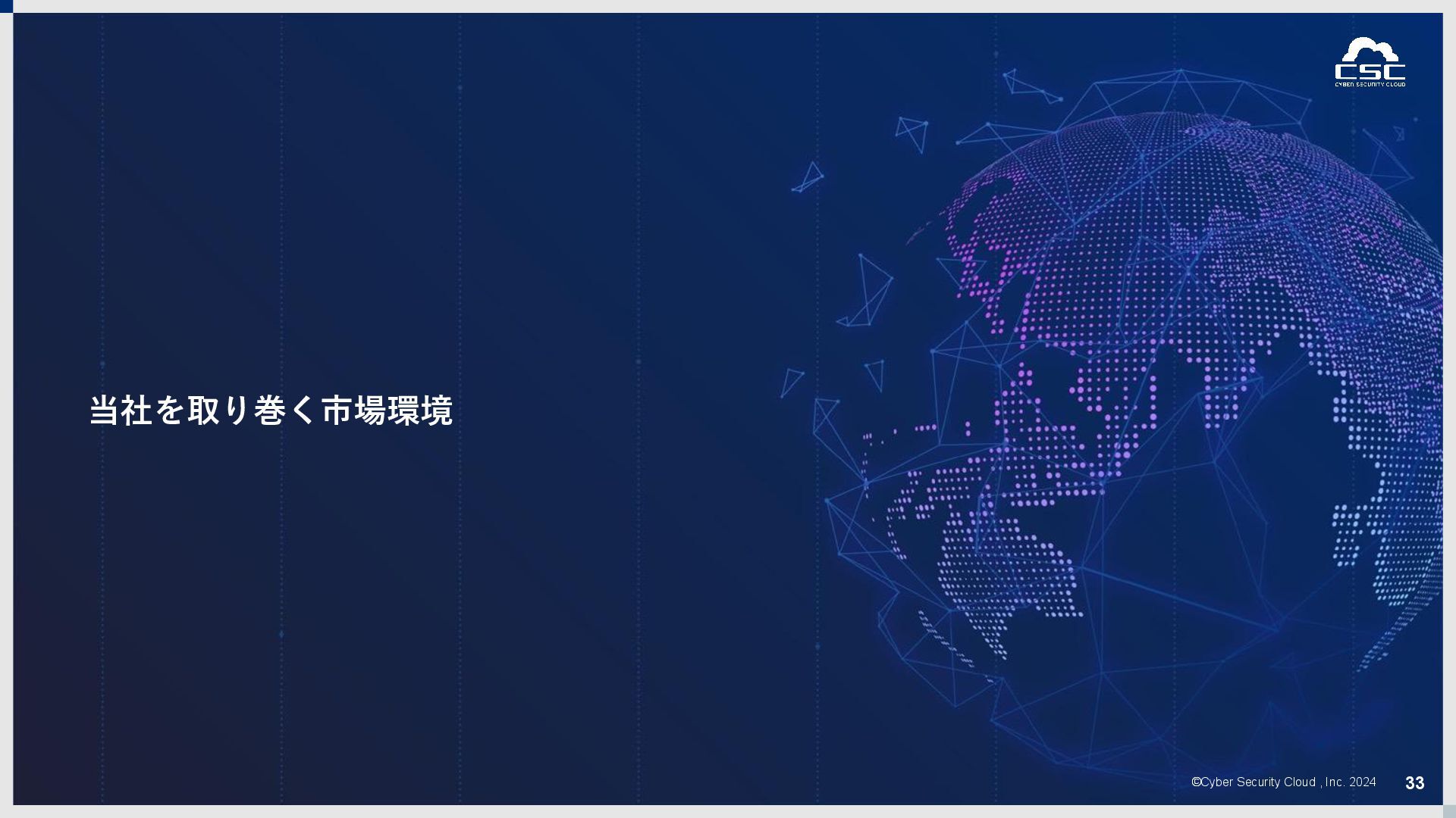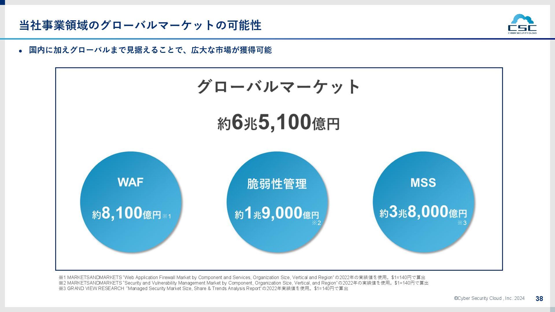 32. 38 ©Cyber Security Cloud , Inc. 2024 当社事業領域のグローバルマーケットの可能性 • 国内に加えグローバルまで見据えることで、広大な市場が獲得可能