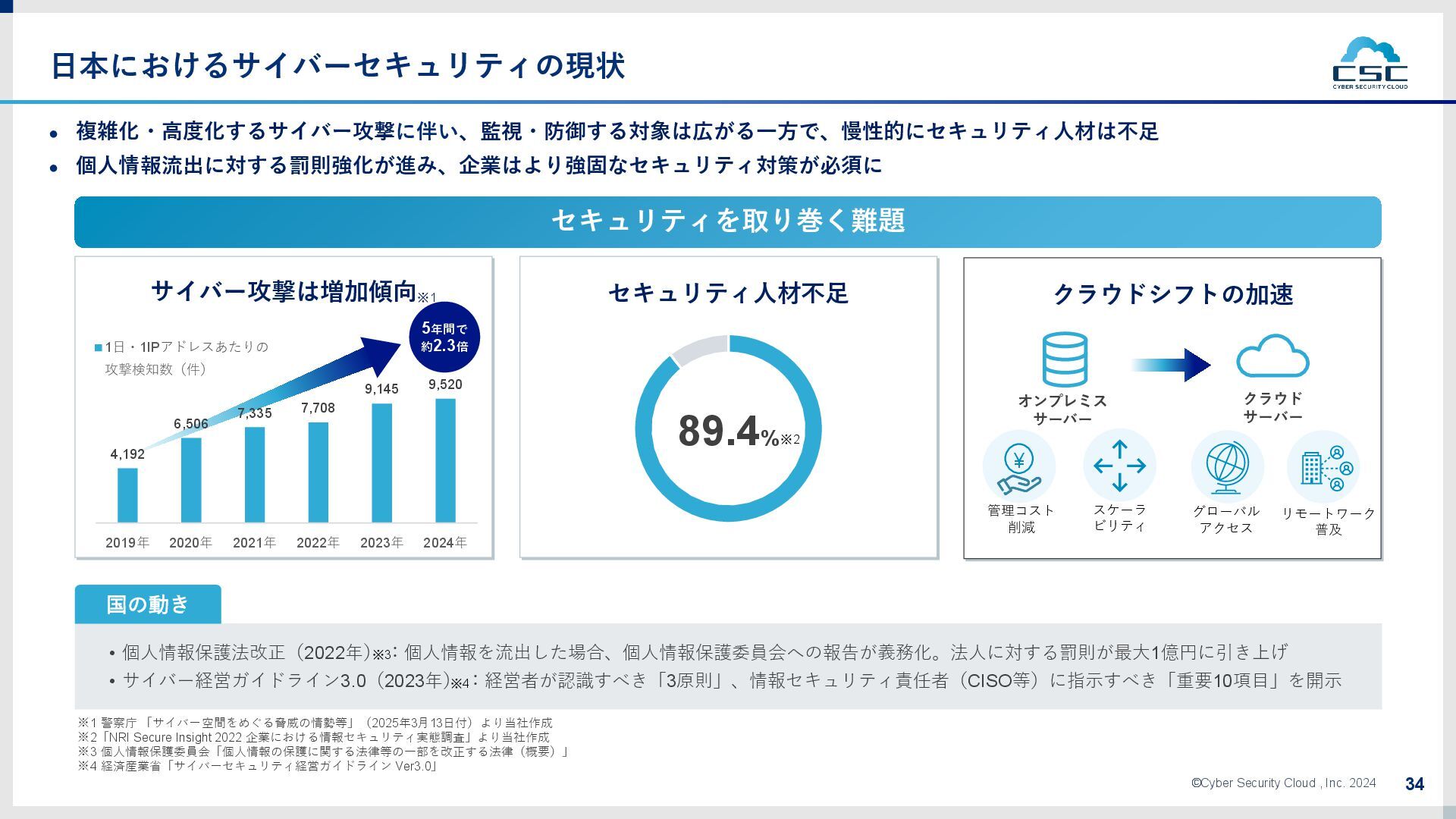 28. 34 ©Cyber Security Cloud , Inc. 2024 日本におけるサイバーセキュリティの現状 • 複雑化・高度化するサイバー攻撃に伴い、監視・防御する対象は広がる一方で、慢性的にセキュリティ人材は不足