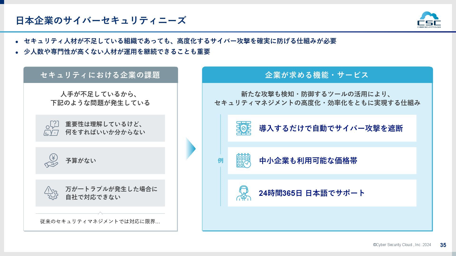 29. 35 ©Cyber Security Cloud , Inc. 2024 日本企業のサイバーセキュリティニーズ • セキュリティ人材が不足している組織であっても、高度化するサイバー攻撃を確実に防げる仕組みが必要