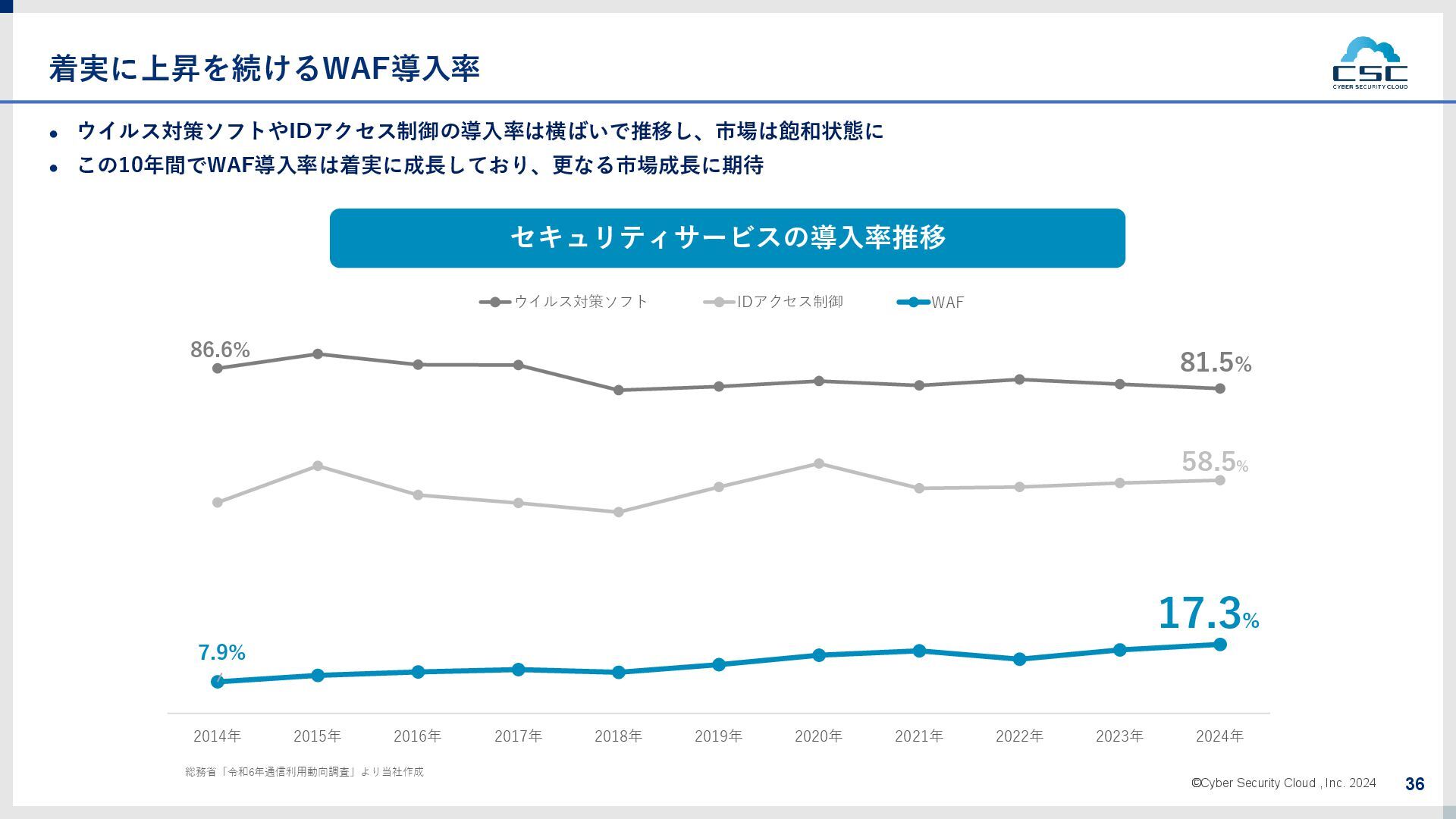 30. 36 ©Cyber Security Cloud , Inc. 2024 着実に上昇を続けるWAF導入率 総務省「令和6年通信利用動向調査」より当社作成 86.6%