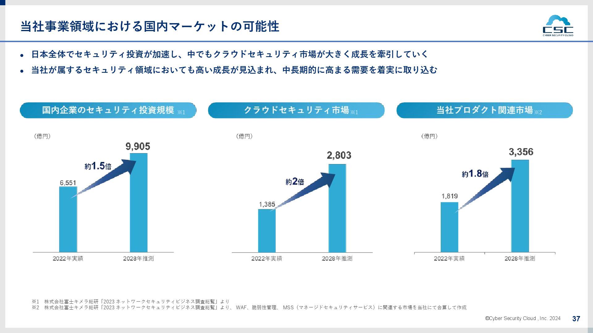 31. 37 ©Cyber Security Cloud , Inc. 2024 当社事業領域における国内マーケットの可能性 • 日本全体でセキュリティ投資が加速し、中でもクラウドセキュリティ市場が大きく成長を牽引していく