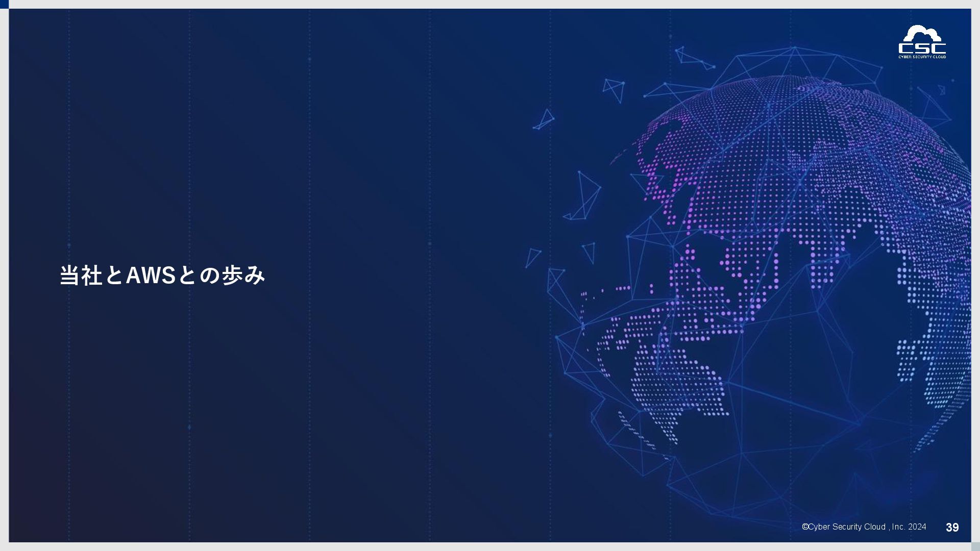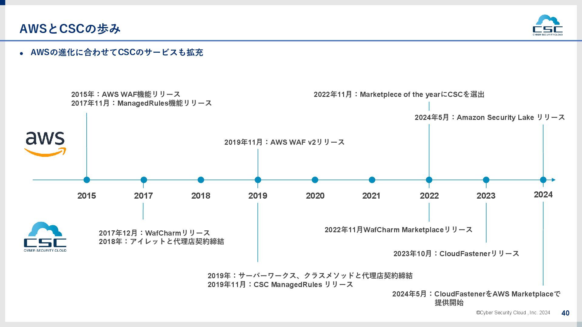 33. 40 ©Cyber Security Cloud , Inc. 2024 AWSとCSCの歩み • AWSの進化に合わせてCSCのサービスも拡充