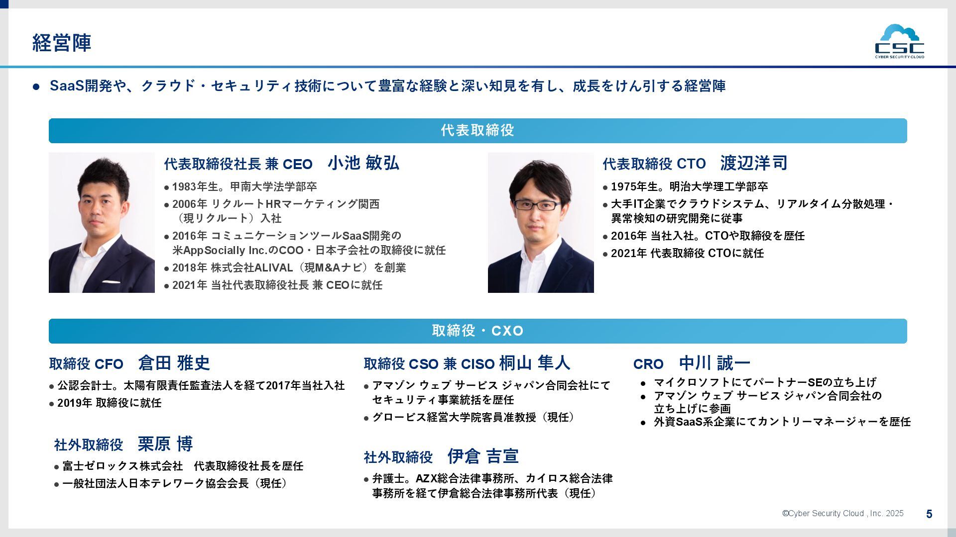 3. 5 ©Cyber Security Cloud , Inc. 2025 経営陣 ⚫ SaaS開発や、クラウド・セキュリティ技術について豊富な経験と深い知見を有し、成長をけん引する経営陣