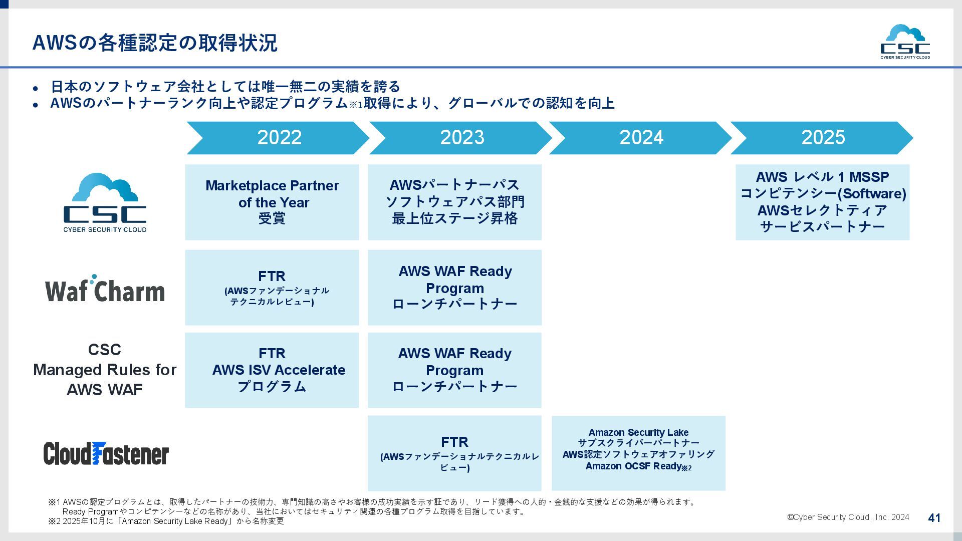 Ready Programやコンピテンシーなどの名称があり、当社においてはセキュリティ関連の各種プログラム取得を目指しています。 ※2 2025年10月に「Amazon Security Lake Ready」から名称変更 • 日本のソフトウェア会社としては唯一無二の実績を誇る • AWSのパートナーランク向上や認定プログラム※1取得により、グローバルでの認知を向上 CSC Managed Rules for AWS WAF FTR (AWSファンデーショナル テクニカルレビュー) Amazon Security Lake サブスクライバーパートナー AWS認定ソフトウェアオファリング Amazon OCSF Ready※2 FTR AWS ISV Accelerate プログラム Marketplace Partner of the Year 受賞 AWSパートナーパス ソフトウェアパス部門 最上位ステージ昇格 AWS WAF Ready Program ローンチパートナー FTR (AWSファンデーショナルテクニカルレ ビュー) 2022 2023 2024 AWS WAF Ready Program ローンチパートナー 2025 AWS レベル 1 MSSP コンピテンシー(Software) AWSセレクトティア サービスパートナー