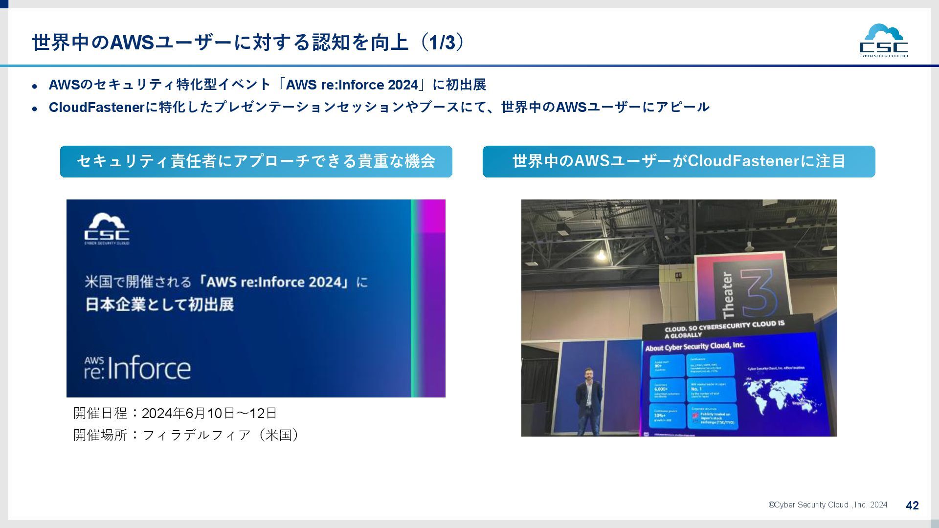 35. 42 ©Cyber Security Cloud , Inc. 2024 世界中のAWSユーザーに対する認知を向上(1/3) • AWSのセキュリティ特化型イベント「AWS
