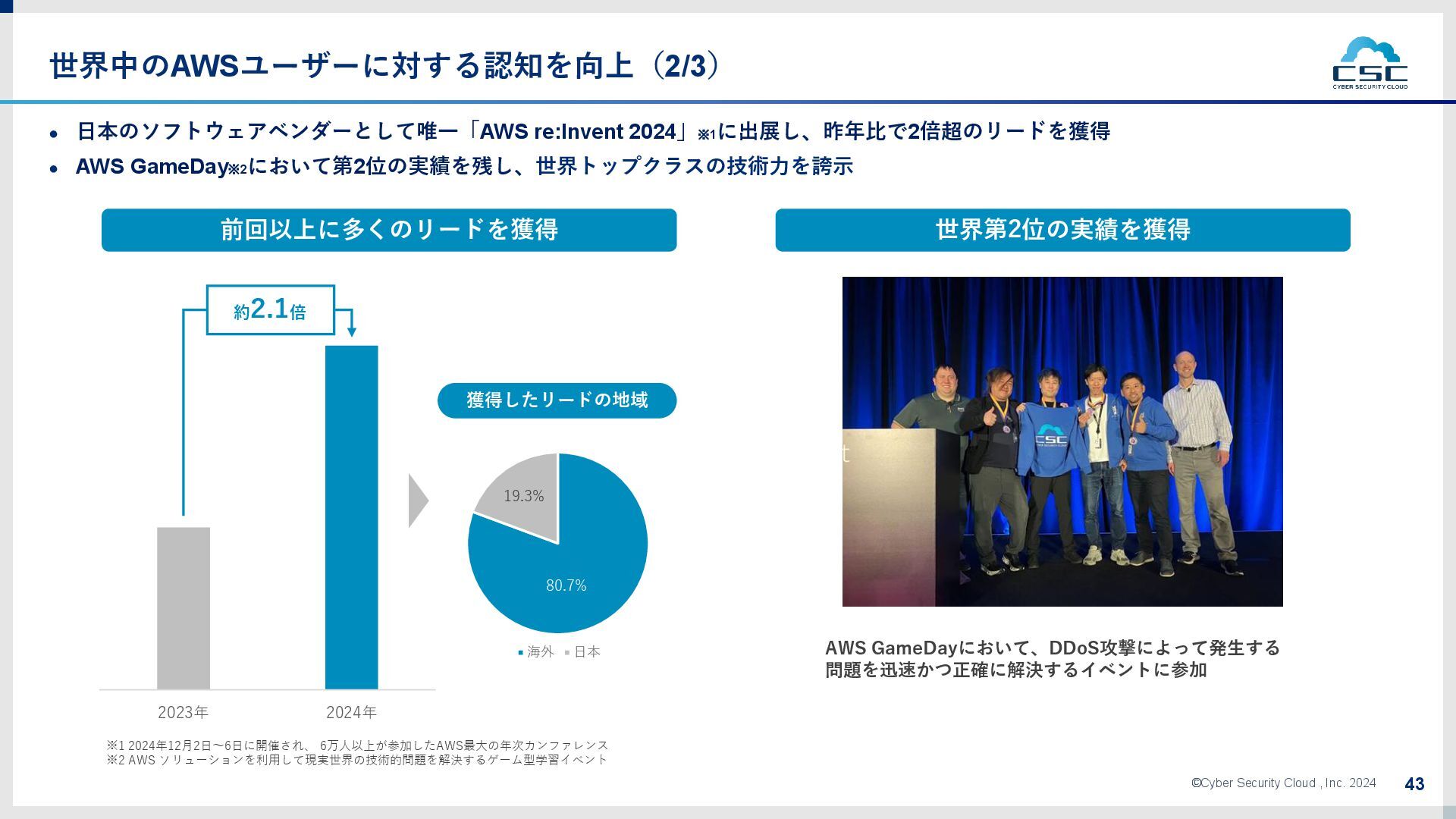 re:Invent 2024」※1 に出展し、昨年比で2倍超のリードを獲得 • AWS GameDay※2 において第2位の実績を残し、世界トップクラスの技術力を誇示 2023年 2024年 前回以上に多くのリードを獲得 80.7% 19.3% 海外 日本 獲得したリードの地域 約 2.1倍 世界第2位の実績を獲得 AWS GameDayにおいて、DDoS攻撃によって発生する 問題を迅速かつ正確に解決するイベントに参加 ※1 2024年12月2日~6日に開催され、 6万人以上が参加したAWS最大の年次カンファレンス ※2 AWS ソリューションを利用して現実世界の技術的問題を解決するゲーム型学習イベント
