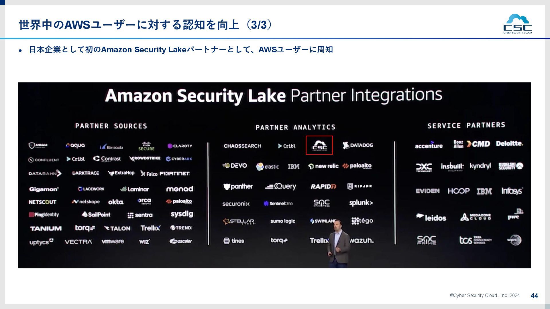 36. 43 ©Cyber Security Cloud , Inc. 2024 世界中のAWSユーザーに対する認知を向上(2/3) • 日本のソフトウェアベンダーとして唯一「AWS