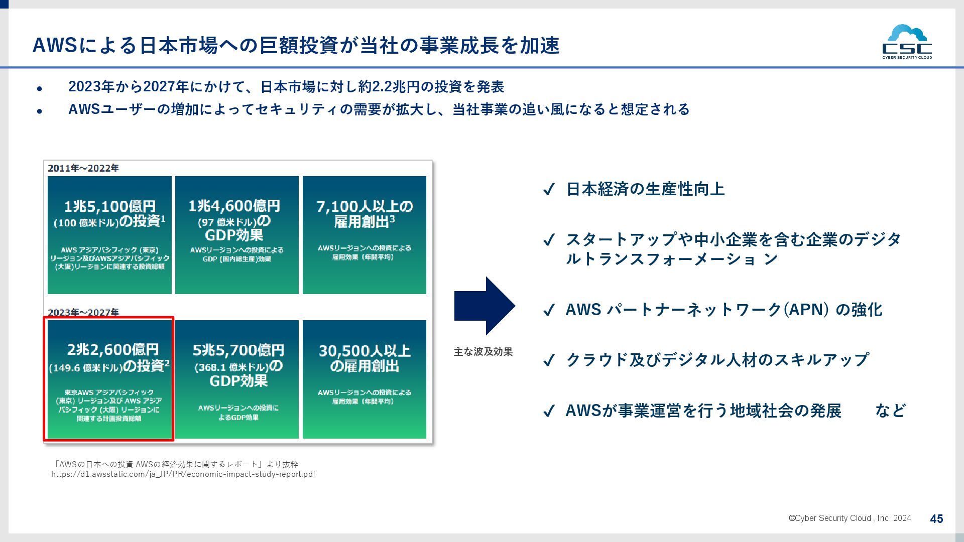 37. 45 ©Cyber Security Cloud , Inc. 2024 AWSによる日本市場への巨額投資が当社の事業成長を加速 • 2023年から2027年にかけて、日本市場に対し約2.2兆円の投資を発表