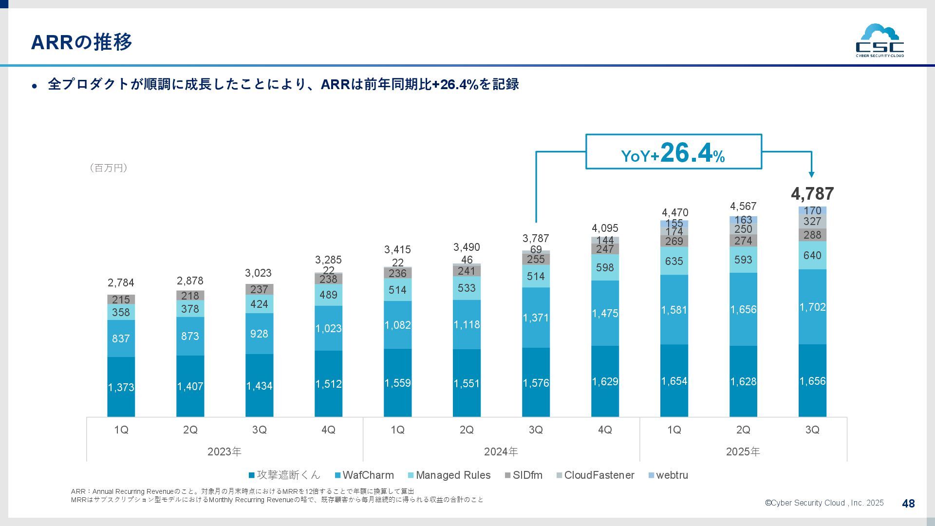 1,512 1,559 1,551 1,576 1,629 1,654 1,628 1,656 837 873 928 1,023 1,082 1,118 1,371 1,475 1,581 1,656 1,702 358 378 424 489 514 533 514 598 635 593 640 215 218 237 238 236 241 255 247 269 274 288 22 22 46 69 144 174 250 327 155 163 170 2,784 2,878 3,023 3,285 3,415 3,490 3,787 4,095 4,470 4,567 4,787 1Q 2Q 3Q 4Q 1Q 2Q 3Q 4Q 1Q 2Q 3Q 2023年 2024年 2025年 攻撃遮断くん WafCharm Managed Rules SIDfm CloudFastener webtru ARRの推移 • 全プロダクトが順調に成長したことにより、ARRは前年同期比+26.4%を記録 ARR:Annual Recurring Revenueのこと。対象月の月末時点におけるMRRを12倍することで年額に換算して算出 MRRはサブスクリプション型モデルにおけるMonthly Recurring Revenueの略で、既存顧客から毎月継続的に得られる収益の合計のこと (百万円) YoY+ 26.4%