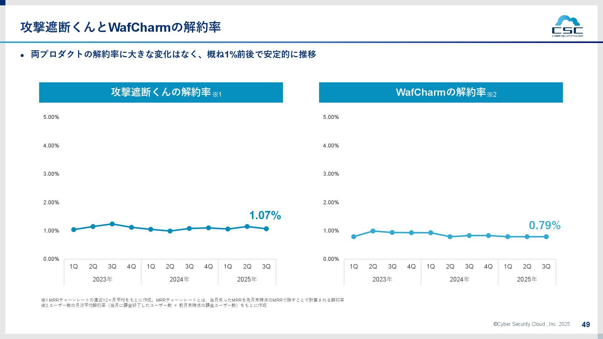 ※1 MRRチャーンレートの直近12ヶ月平均をもとに作成。MRRチャーンレートとは、当月失ったMRRを先月末時点のMRRで除すことで計算される解約率 ※2 ユーザー数の月次平均解約率(当月に課金終了したユーザー数 ÷ 前月末時点の課金ユーザー数)をもとに作成 攻撃遮断くんの解約率 WafCharmの解約率 ※1 ※2 1.07% 0.00% 1.00% 2.00% 3.00% 4.00% 5.00% 1Q 2Q 3Q 4Q 1Q 2Q 3Q 4Q 1Q 2Q 3Q 2023年 2024年 2025年 0.79% 0.00% 1.00% 2.00% 3.00% 4.00% 5.00% 1Q 2Q 3Q 4Q 1Q 2Q 3Q 4Q 1Q 2Q 3Q 2023年 2024年 2025年