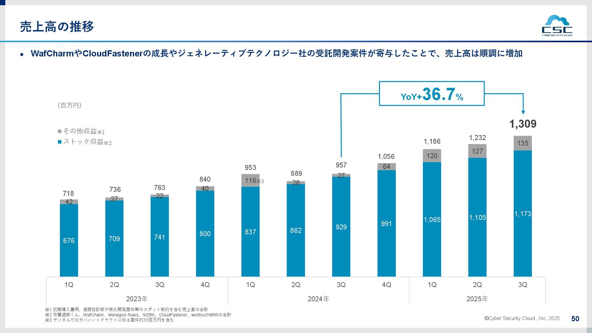 800 837 862 929 991 1,065 1,105 1,173 42 27 22 40 116 26 27 64 120 127 135 718 736 763 840 953 889 957 1,056 1,186 1,232 1,309 1Q 2Q 3Q 4Q 1Q 2Q 3Q 4Q 1Q 2Q 3Q 2023年 2024年 2025年 その他収益 ストック収益 売上高の推移 • WafCharmやCloudFastenerの成長やジェネレーティブテクノロジー社の受託開発案件が寄与したことで、売上高は順調に増加 ※1 初期導入費用、脆弱性診断や受託開発案件等のスポット契約を含む売上高の合計 ※2 攻撃遮断くん、WafCharm、Managed Rules、SIDfm、CloudFastener、webtruのMRRの合計 ※3 デジタル庁のガバメントクラウドに係る案件約70百万円を含む (百万円) YoY+ 36.7% ※1 ※2 ※3