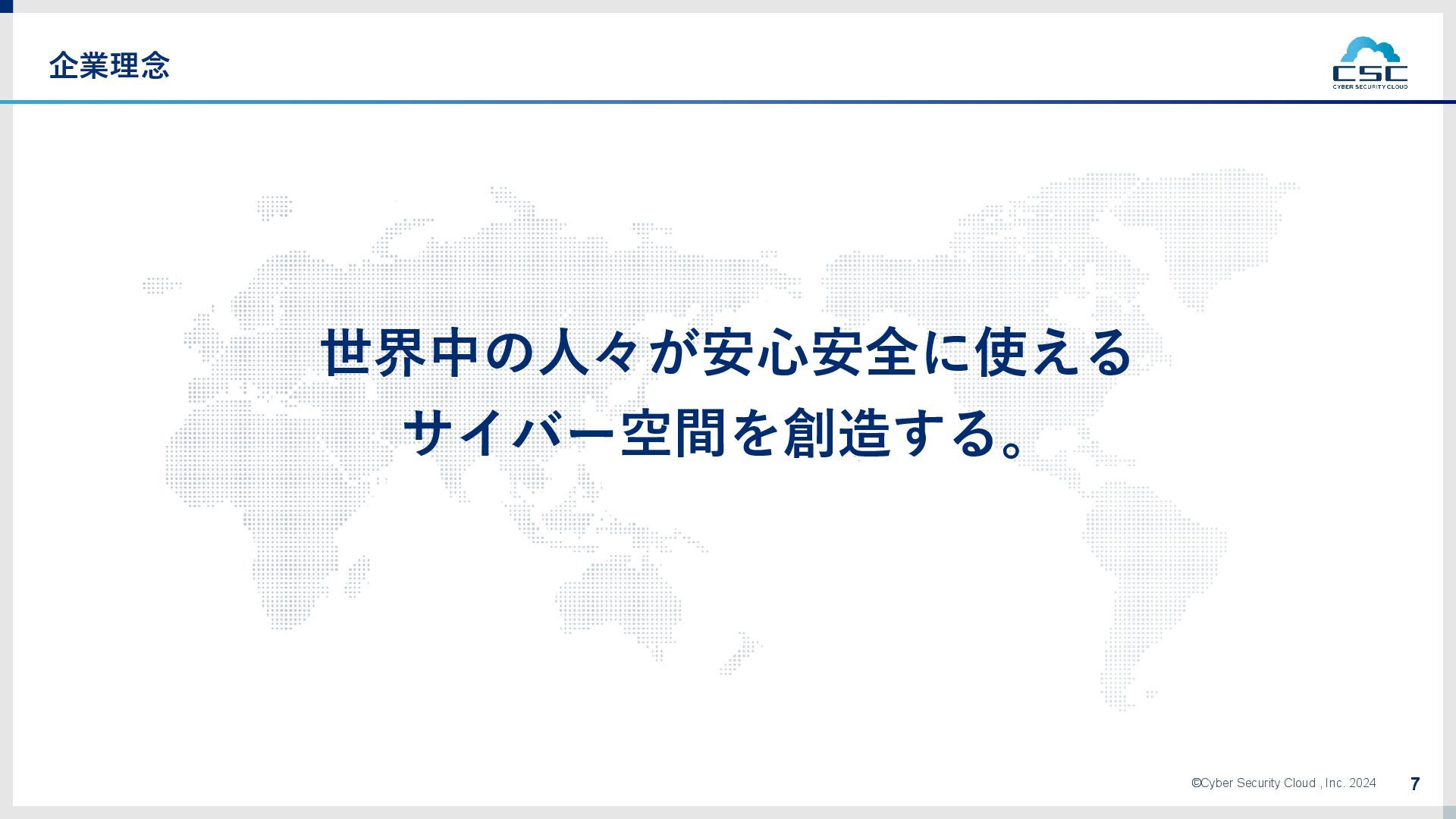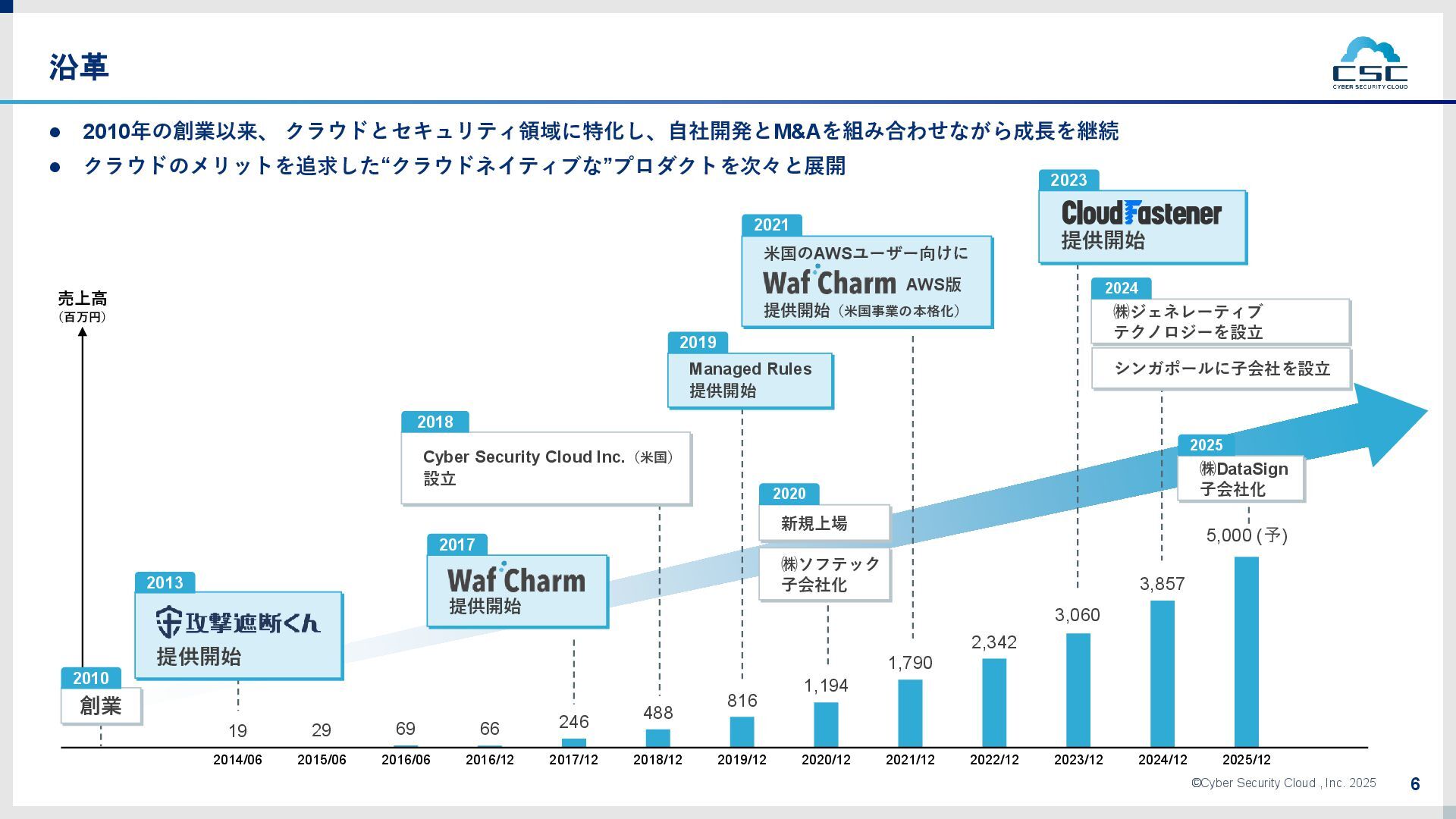 66 246 488 816 1,194 1,790 2,342 3,060 3,857 5,000 (予) 2014/06 2015/06 2016/06 2016/12 2017/12 2018/12 2019/12 2020/12 2021/12 2022/12 2023/12 2024/12 2025/12 沿革 ⚫ 2010年の創業以来、 クラウドとセキュリティ領域に特化し、自社開発とM&Aを組み合わせながら成長を継続 ⚫ クラウドのメリットを追求した“クラウドネイティブな”プロダクトを次々と展開 ㈱ソフテック 子会社化 創業 提供開始 2013 提供開始 2017 Cyber Security Cloud Inc.(米国) 設立 2018 新規上場 2020 米国のAWSユーザー向けに AWS版 提供開始(米国事業の本格化) 2021 提供開始 2010 Managed Rules 提供開始 売上高 (百万円) 2023 2019 ㈱ジェネレーティブ テクノロジーを設立 2024 シンガポールに子会社を設立 ㈱DataSign 子会社化 2025
