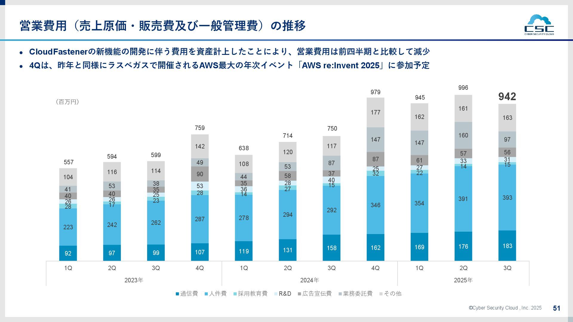 • 4Qは、昨年と同様にラスベガスで開催されるAWS最大の年次イベント「AWS re:Invent 2025」に参加予定 92 97 99 107 119 131 158 162 169 176 183 223 242 262 287 278 294 292 346 354 391 393 28 17 23 28 14 27 15 32 22 14 15 26 26 25 53 36 28 40 25 27 33 31 40 40 35 90 35 58 37 87 61 57 56 41 53 38 49 44 53 87 147 147 160 97 104 116 114 142 108 120 117 177 162 161 163 557 594 599 759 638 714 750 979 945 996 942 1Q 2Q 3Q 4Q 1Q 2Q 3Q 4Q 1Q 2Q 3Q 2023年 2024年 2025年 通信費 人件費 採用教育費 R&D 広告宣伝費 業務委託費 その他 (百万円)