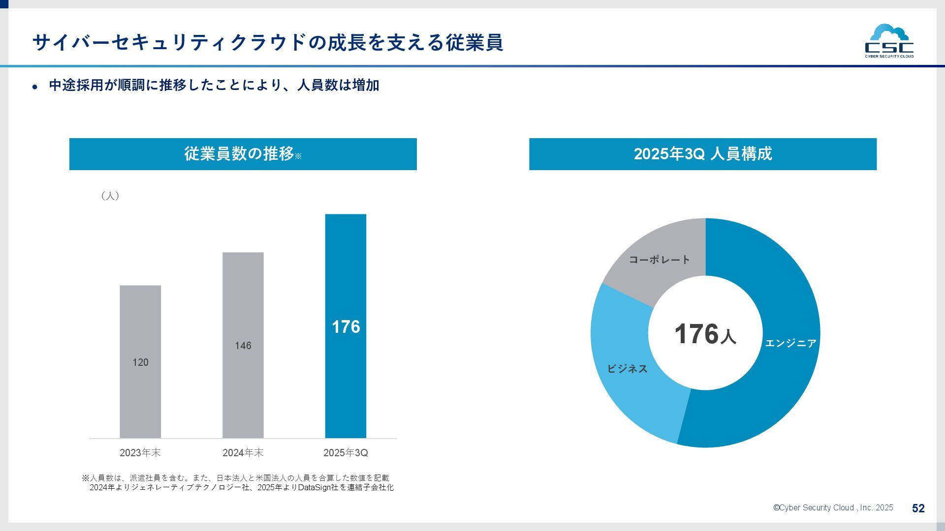 サイバーセキュリティクラウドの成長を支える従業員 • 中途採用が順調に推移したことにより、人員数は増加 従業員数の推移※ 2025年3Q 人員構成 120 146 176 2023年末 2024年末 2025年3Q ※人員数は、派遣社員を含む。また、日本法人と米国法人の人員を合算した数値を記載 2024年よりジェネレーティブテクノロジー社、2025年よりDataSign社を連結子会社化 (人) 176人