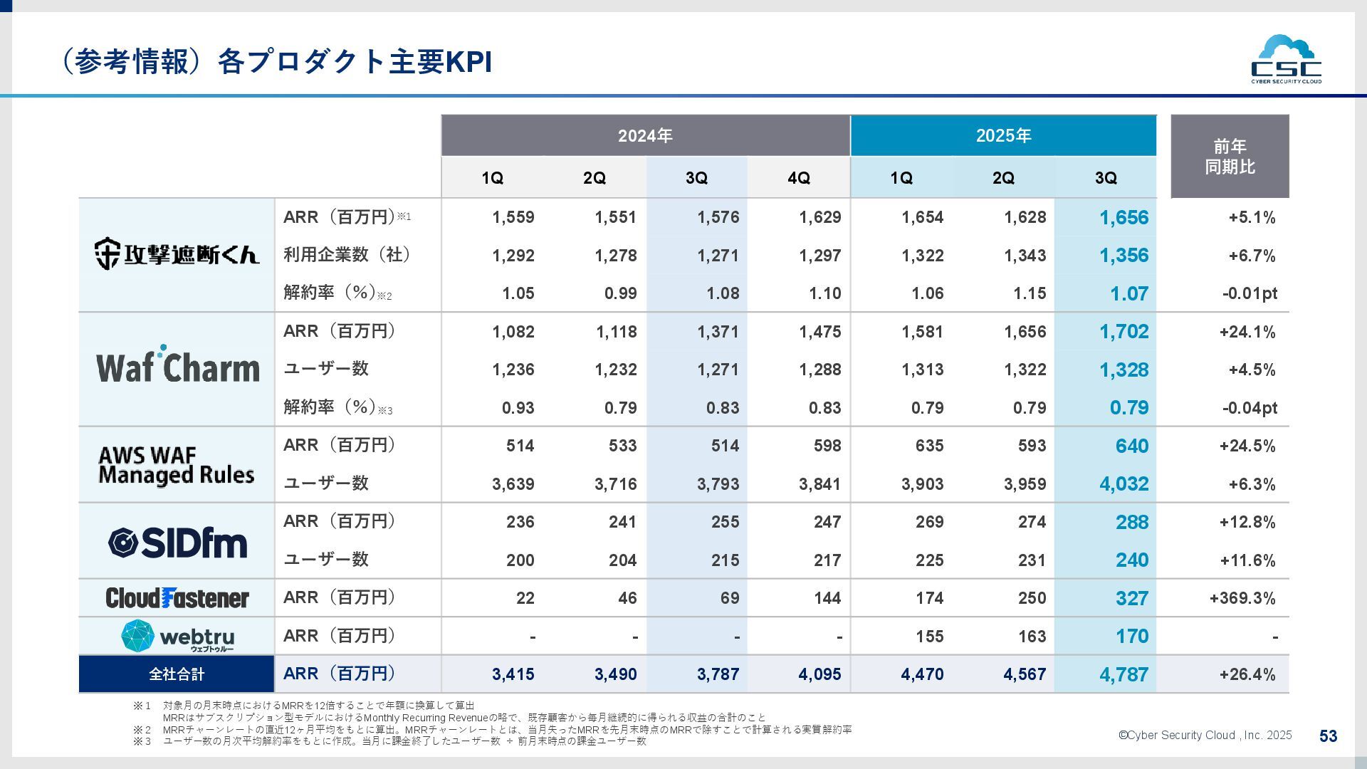 前年 同期比 1Q 2Q 3Q 4Q 1Q 2Q 3Q ARR(百万円) 1,559 1,551 1,576 1,629 1,654 1,628 1,656 +5.1% 利用企業数(社) 1,292 1,278 1,271 1,297 1,322 1,343 1,356 +6.7% 解約率(%) 1.05 0.99 1.08 1.10 1.06 1.15 1.07 -0.01pt ARR(百万円) 1,082 1,118 1,371 1,475 1,581 1,656 1,702 +24.1% ユーザー数 1,236 1,232 1,271 1,288 1,313 1,322 1,328 +4.5% 解約率(%) 0.93 0.79 0.83 0.83 0.79 0.79 0.79 -0.04pt ARR(百万円) 514 533 514 598 635 593 640 +24.5% ユーザー数 3,639 3,716 3,793 3,841 3,903 3,959 4,032 +6.3% ARR(百万円) 236 241 255 247 269 274 288 +12.8% ユーザー数 200 204 215 217 225 231 240 +11.6% ARR(百万円) 22 46 69 144 174 250 327 +369.3% ARR(百万円) - - - - 155 163 170 - 全社合計 ARR(百万円) 3,415 3,490 3,787 4,095 4,470 4,567 4,787 +26.4% ※1 対象月の月末時点におけるMRRを12倍することで年額に換算して算出 MRRはサブスクリプション型モデルにおけるMonthly Recurring Revenueの略で、既存顧客から毎月継続的に得られる収益の合計のこと ※2 MRRチャーンレートの直近12ヶ月平均をもとに算出。MRRチャーンレートとは、当月失ったMRRを先月末時点のMRRで除すことで計算される実質解約率 ※3 ユーザー数の月次平均解約率をもとに作成。当月に課金終了したユーザー数 ÷ 前月末時点の課金ユーザー数 ※1 ※2 ※3