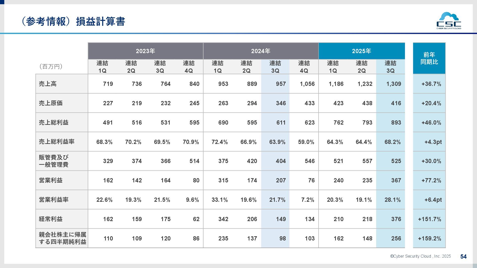 2025年 前年 同期比 (百万円) 連結 1Q 連結 2Q 連結 3Q 連結 4Q 連結 1Q 連結 2Q 連結 3Q 連結 4Q 連結 1Q 連結 2Q 連結 3Q 売上高 719 736 764 840 953 889 957 1,056 1,186 1,232 1,309 +36.7% 売上原価 227 219 232 245 263 294 346 433 423 438 416 +20.4% 売上総利益 491 516 531 595 690 595 611 623 762 793 893 +46.0% 売上総利益率 68.3% 70.2% 69.5% 70.9% 72.4% 66.9% 63.9% 59.0% 64.3% 64.4% 68.2% +4.3pt 販管費及び 一般管理費 329 374 366 514 375 420 404 546 521 557 525 +30.0% 営業利益 162 142 164 80 315 174 207 76 240 235 367 +77.2% 営業利益率 22.6% 19.3% 21.5% 9.6% 33.1% 19.6% 21.7% 7.2% 20.3% 19.1% 28.1% +6.4pt 経常利益 162 159 175 62 342 206 149 134 210 218 376 +151.7% 親会社株主に帰属 する四半期純利益 110 109 120 86 235 137 98 103 162 148 256 +159.2%