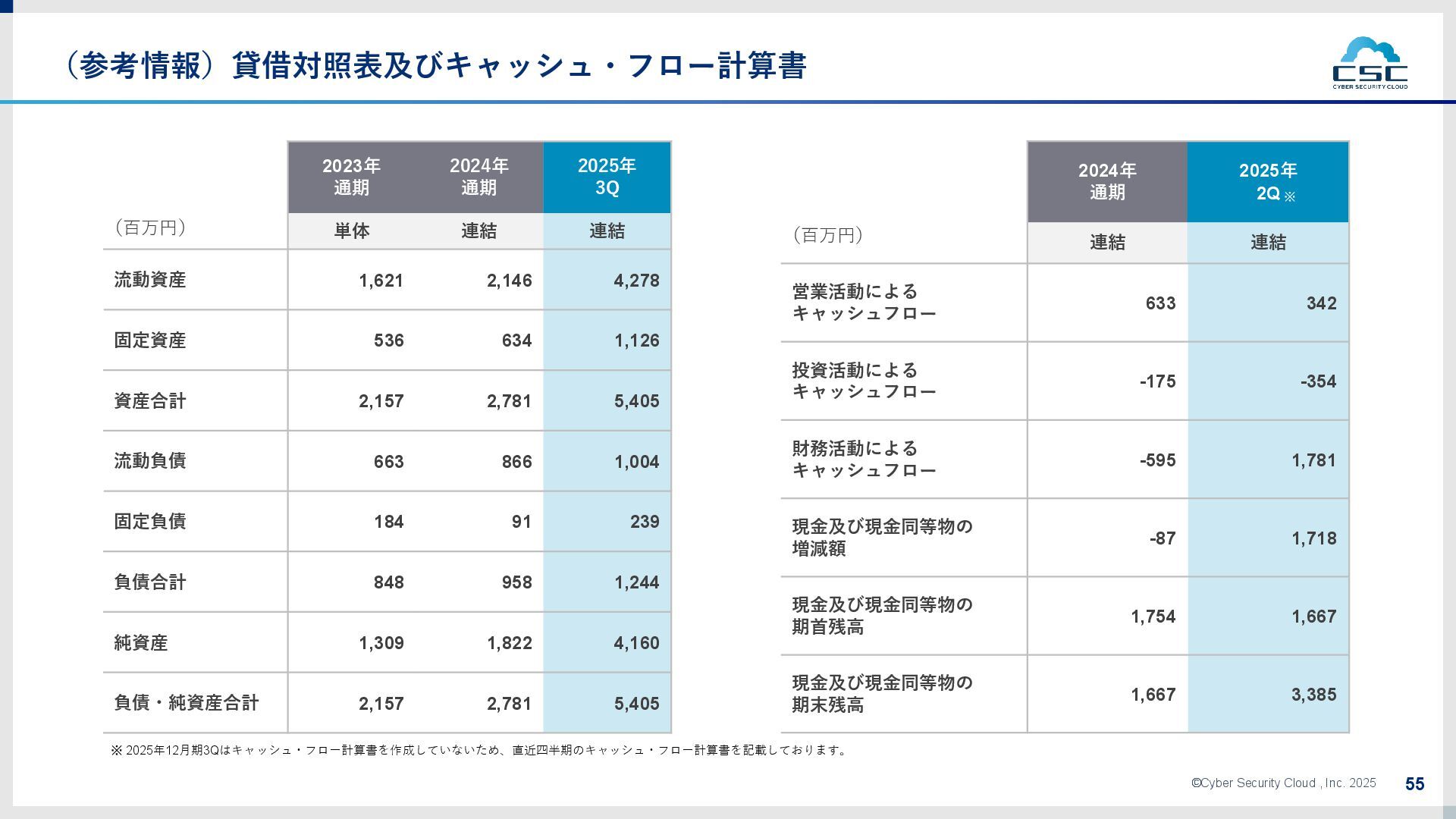 通期 2024年 通期 2025年 3Q 単体 連結 連結 流動資産 1,621 2,146 4,278 固定資産 536 634 1,126 資産合計 2,157 2,781 5,405 流動負債 663 866 1,004 固定負債 184 91 239 負債合計 848 958 1,244 純資産 1,309 1,822 4,160 負債・純資産合計 2,157 2,781 5,405 (百万円) 2024年 通期 2025年 2Q 連結 連結 営業活動による キャッシュフロー 633 342 投資活動による キャッシュフロー -175 -354 財務活動による キャッシュフロー -595 1,781 現金及び現金同等物の 増減額 -87 1,718 現金及び現金同等物の 期首残高 1,754 1,667 現金及び現金同等物の 期末残高 1,667 3,385 ※ 2025年12月期3Qはキャッシュ・フロー計算書を作成していないため、直近四半期のキャッシュ・フロー計算書を記載しております。 ※