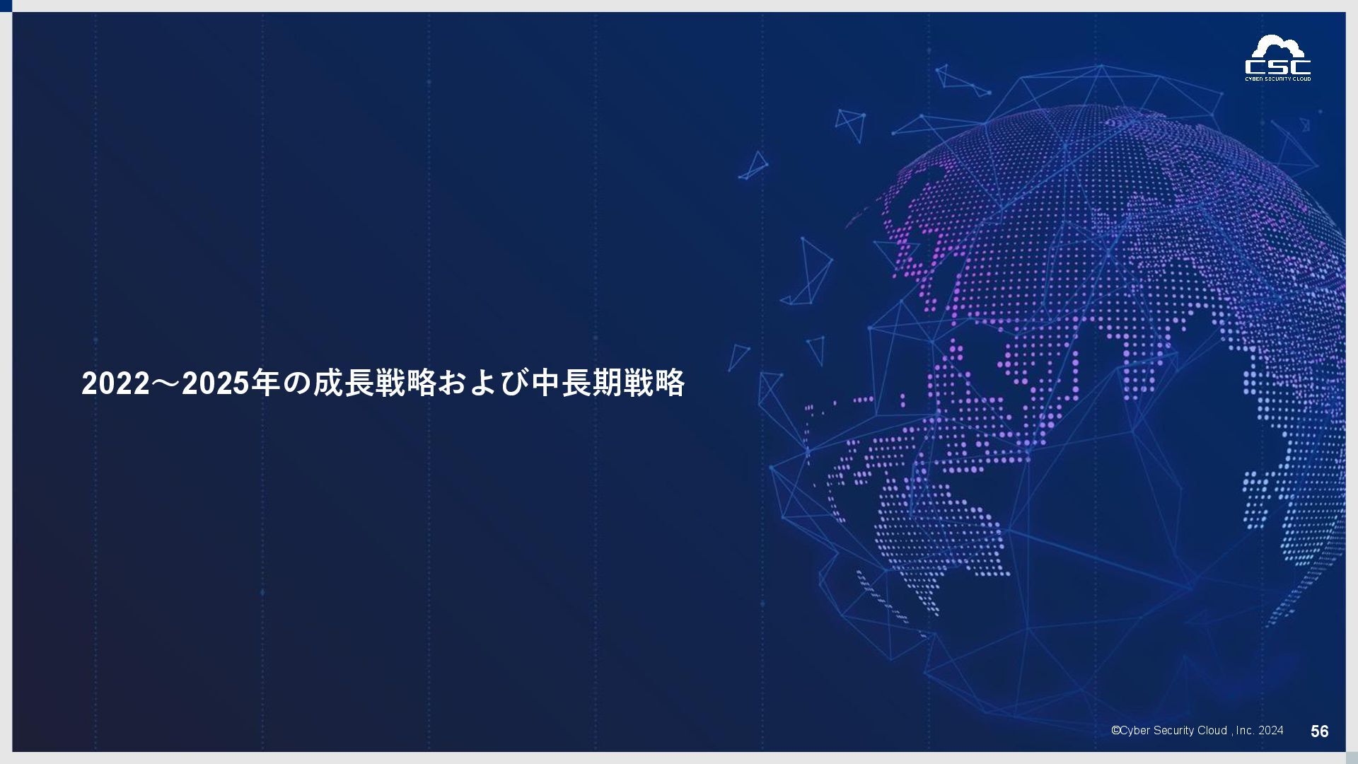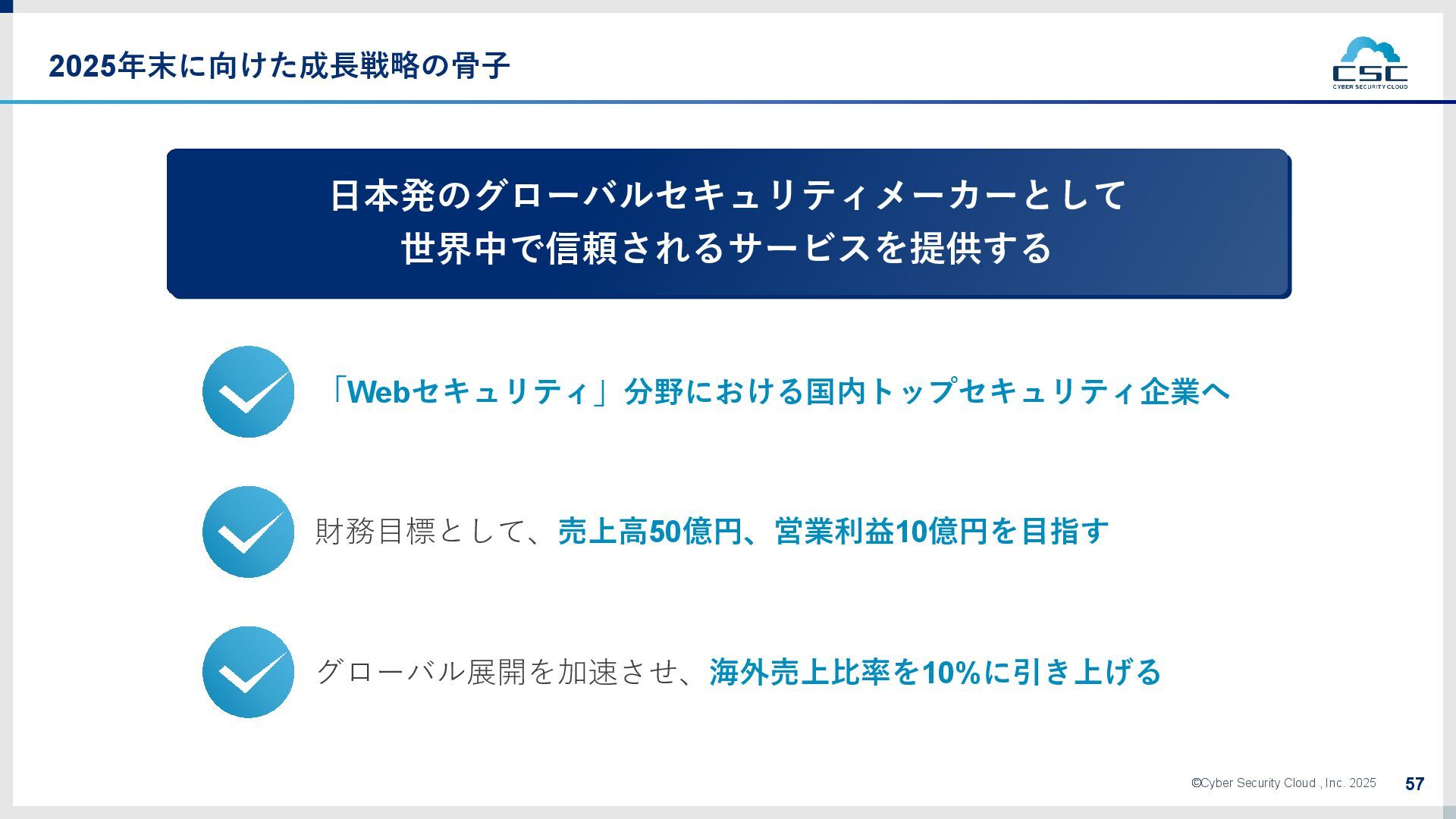 47. 57 ©Cyber Security Cloud , Inc. 2025 2025年末に向けた成長戦略の骨子 日本発のグローバルセキュリティメーカーとして 世界中で信頼されるサービスを提供する