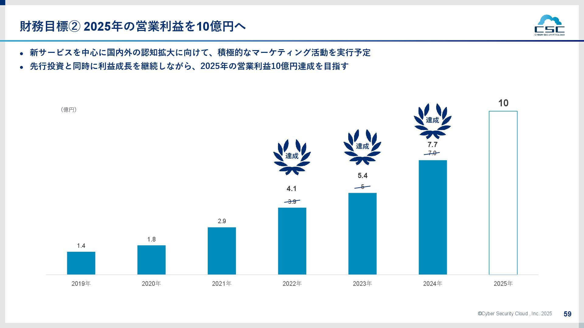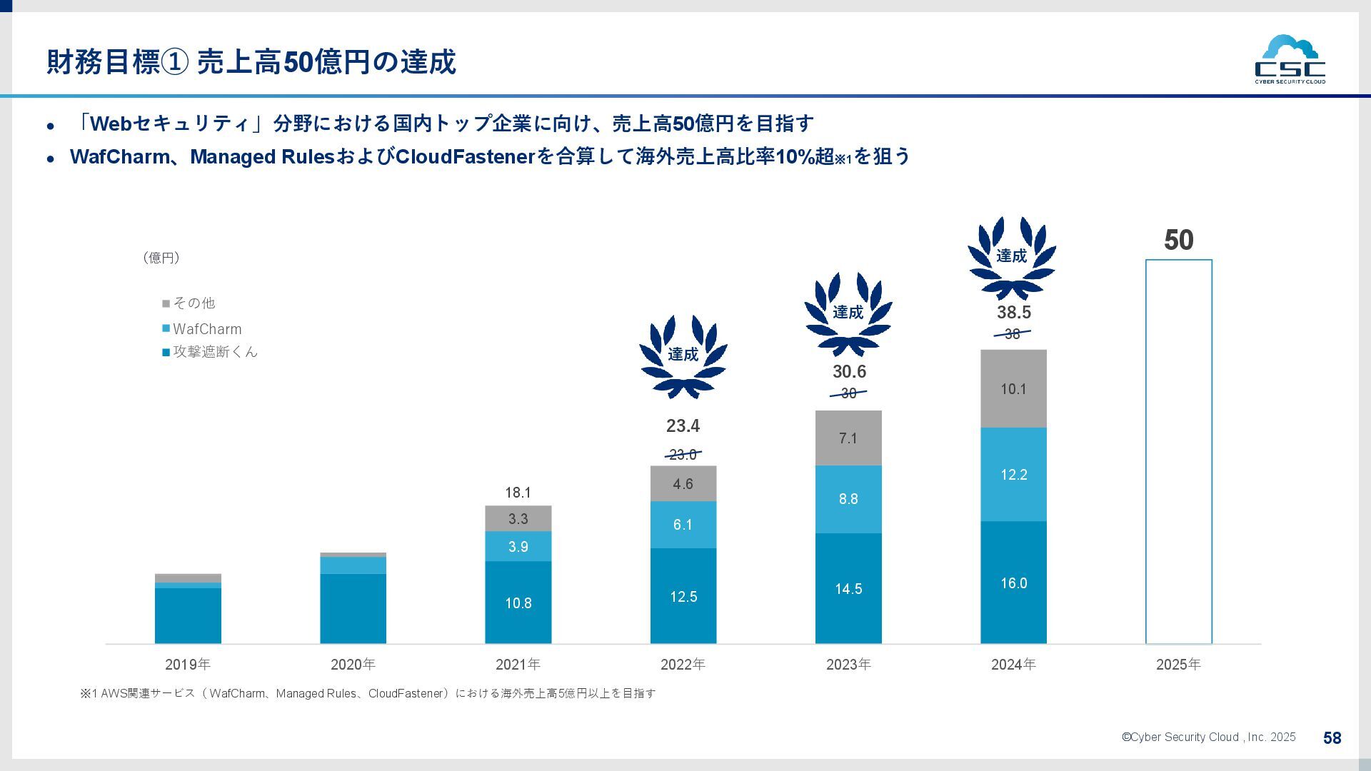 16.0 3.9 6.1 8.8 12.2 3.3 4.6 7.1 10.1 18.1 23.0 30 38 50 2019年 2020年 2021年 2022年 2023年 2024年 2025年 その他 WafCharm 攻撃遮断くん 財務目標① 売上高50億円の達成 • 「Webセキュリティ」分野における国内トップ企業に向け、売上高50億円を目指す • WafCharm、Managed RulesおよびCloudFastenerを合算して海外売上高比率10%超※1 を狙う (億円) 達成 達成 30.6 23.4 ※1 AWS関連サービス( WafCharm、Managed Rules、CloudFastener)における海外売上高5億円以上を目指す 38.5 達成