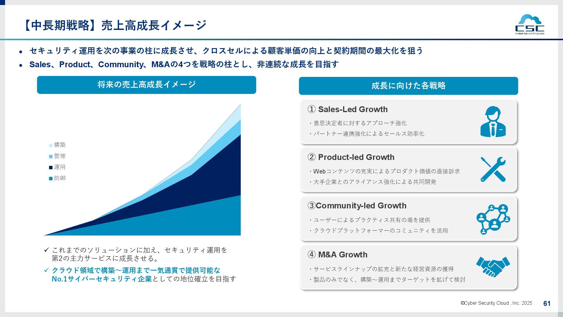 51. 61 ©Cyber Security Cloud , Inc. 2025 【中長期戦略】売上高成長イメージ • セキュリティ運用を次の事業の柱に成長させ、クロスセルによる顧客単価の向上と契約期間の最大化を狙う