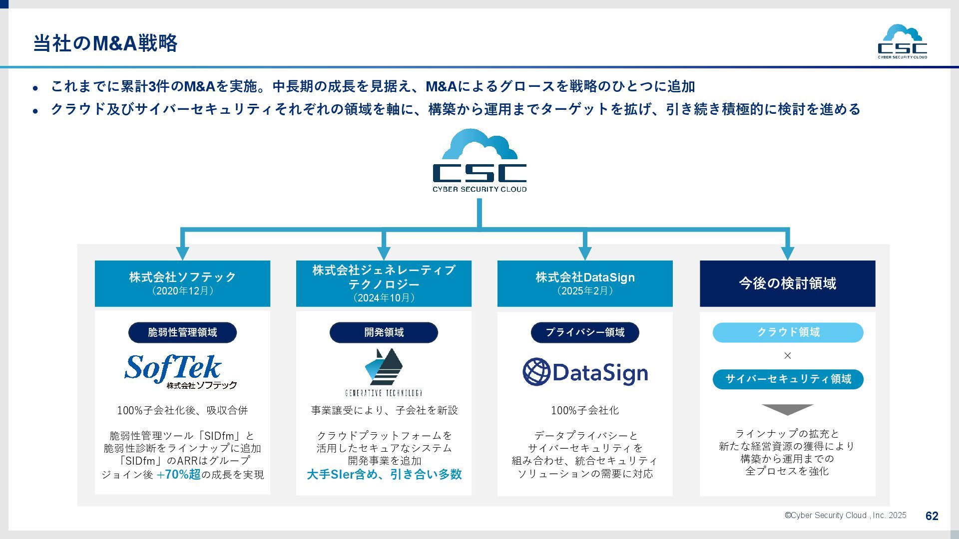 52. 62 ©Cyber Security Cloud , Inc. 2025 当社のM&A戦略 • これまでに累計3件のM&Aを実施。中長期の成長を見据え、M&Aによるグロースを戦略のひとつに追加