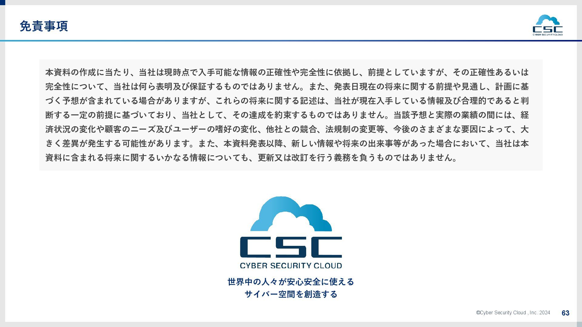 53. 63 ©Cyber Security Cloud , Inc. 2024 本資料の作成に当たり、当社は現時点で入手可能な情報の正確性や完全性に依拠し、前提としていますが、その正確性あるいは 完全性について、当社は何ら表明及び保証するものではありません。また、発表日現在の将来に関する前提や見通し、計画に基 づく予想が含まれている場合がありますが、これらの将来に関する記述は、当社が現在入手している情報及び合理的であると判