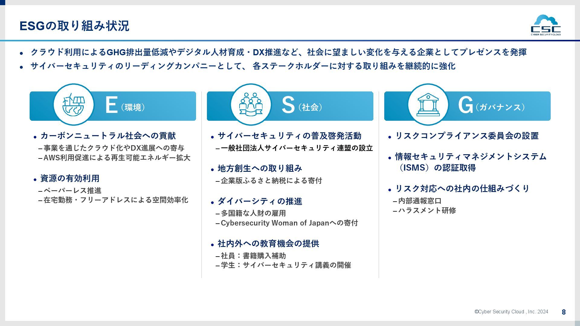 5. 8 ©Cyber Security Cloud , Inc. 2024 ESGの取り組み状況 • クラウド利用によるGHG排出量低減やデジタル人材育成・DX推進など、社会に望ましい変化を与える企業としてプレゼンスを発揮