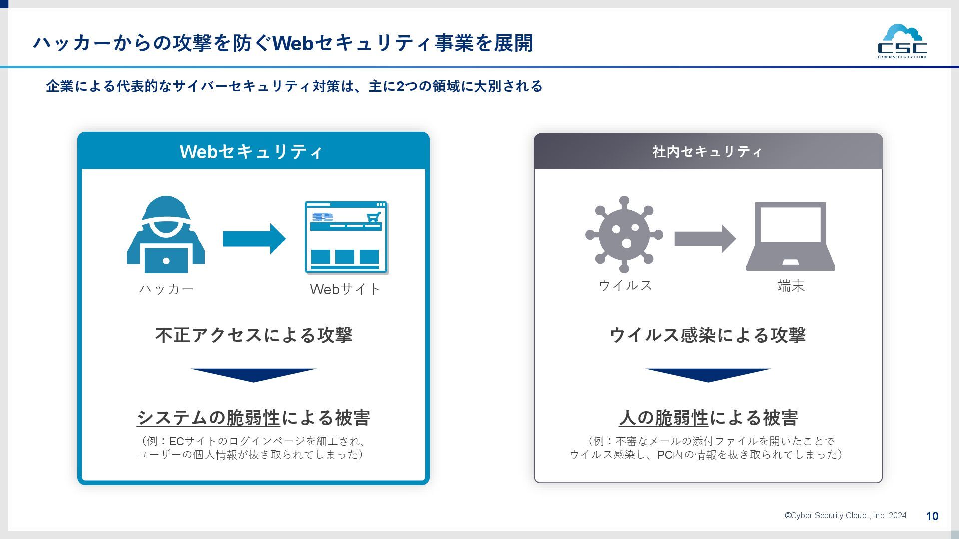 6. 10 ©Cyber Security Cloud , Inc. 2024 ハッカーからの攻撃を防ぐWebセキュリティ事業を展開 企業による代表的なサイバーセキュリティ対策は、主に2つの領域に大別される 社内セキュリティ
