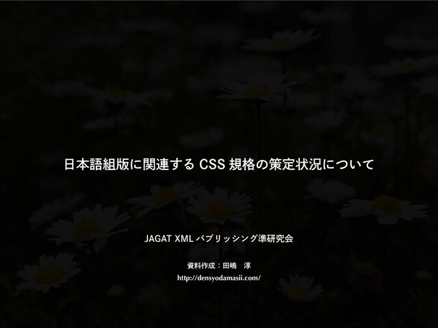 日本語組版に関連する CSS 規格の策定状況について JAGAT XML パブリッシング準研究会 資料作成:田嶋 淳 http://densyodamasii.com/