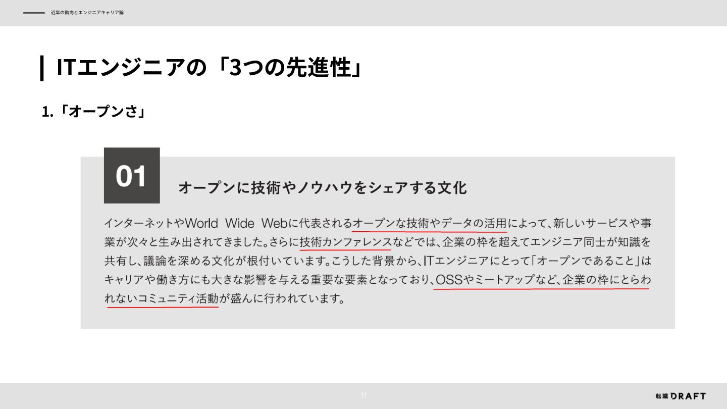 10 ITエンジニアという職種の先進性 1. オープンにモノを作っていく⽂化 2. 組織に依存しない技能の習得 3. 共通化された仕事の進め⽅ 「3つの先進性」 近年の動向とエンジニアキャリア論