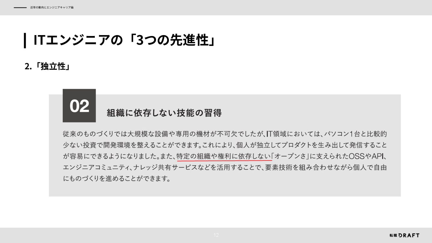 12 ITエンジニアの「3つの先進性」 2.「独⽴性」 近年の動向とエンジニアキャリア論