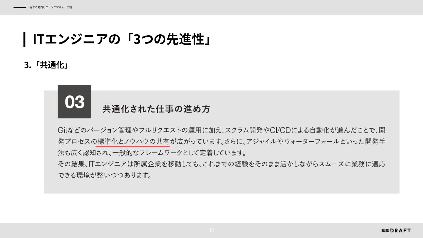 13 ITエンジニアの「3つの先進性」 3.「共通化」 近年の動向とエンジニアキャリア論