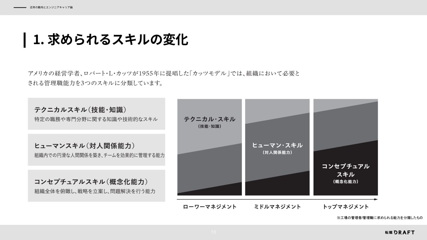 16 1. 求められるスキルの変化 ※工場の管理者/管理職に求められる能力を分類したもの 近年の動向とエンジニアキャリア論