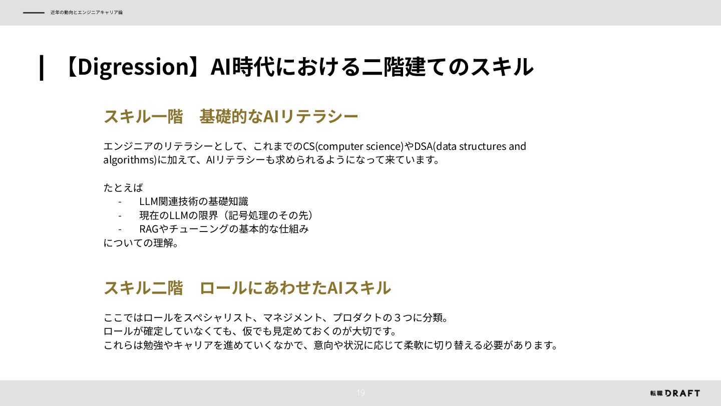 19 【Digression】AI時代における⼆階建てのスキル スキル⼀階 基礎的なAIリテラシー エンジニアのリテラシーとして、これまでのCS(computer science)やDSA(data structures and algorithms)に加えて、AIリテラシーも求められるようになって来ています。 たとえば -