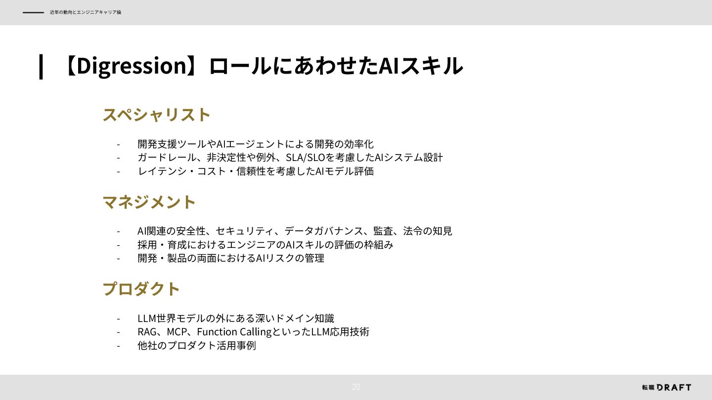 20 【Digression】ロールにあわせたAIスキル スペシャリスト - 開発⽀援ツールやAIエージェントによる開発の効率化 - ガードレール、⾮決定性や例外、SLA/SLOを考慮したAIシステム設計 - レイテンシ‧コスト‧信頼性を考慮したAIモデル評価 マネジメント