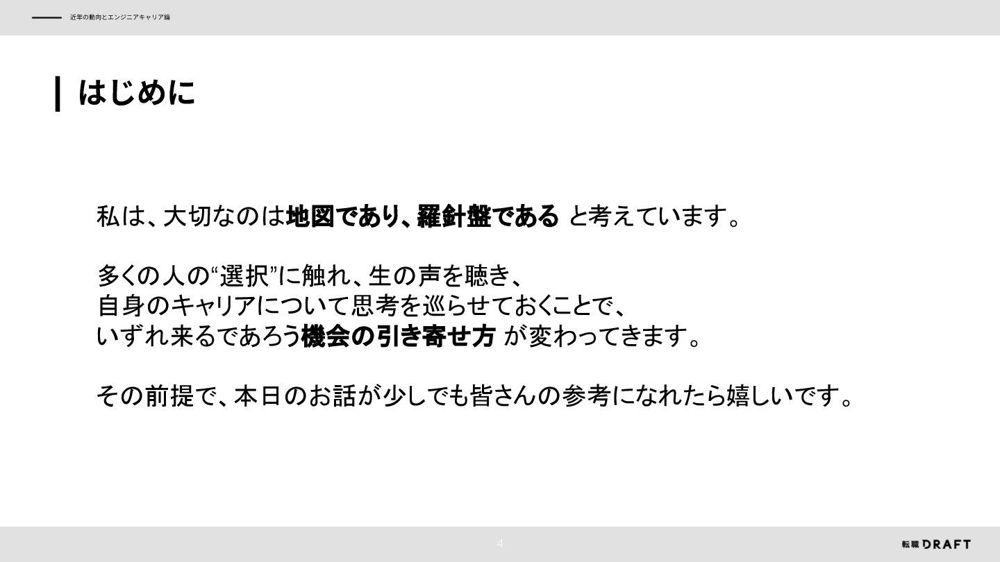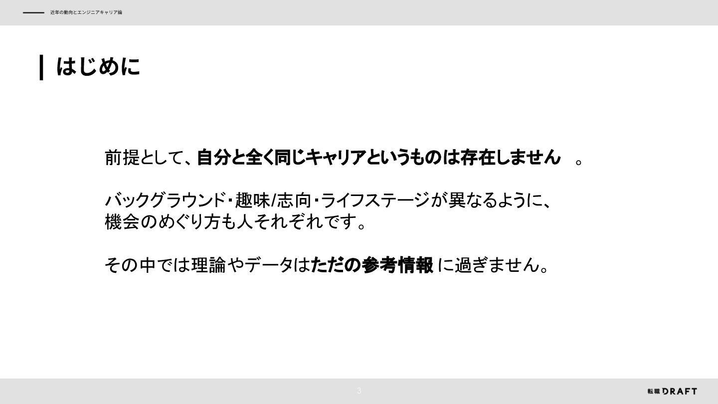 3 はじめに 近年の動向とエンジニアキャリア論 前提として、自分と全く同じキャリアというものは存在しません 。 バックグラウンド・趣味/志向・ライフステージが異なるように、 機会のめぐり方も人それぞれです。 その中では理論やデータはただの参考情報 に過ぎません。