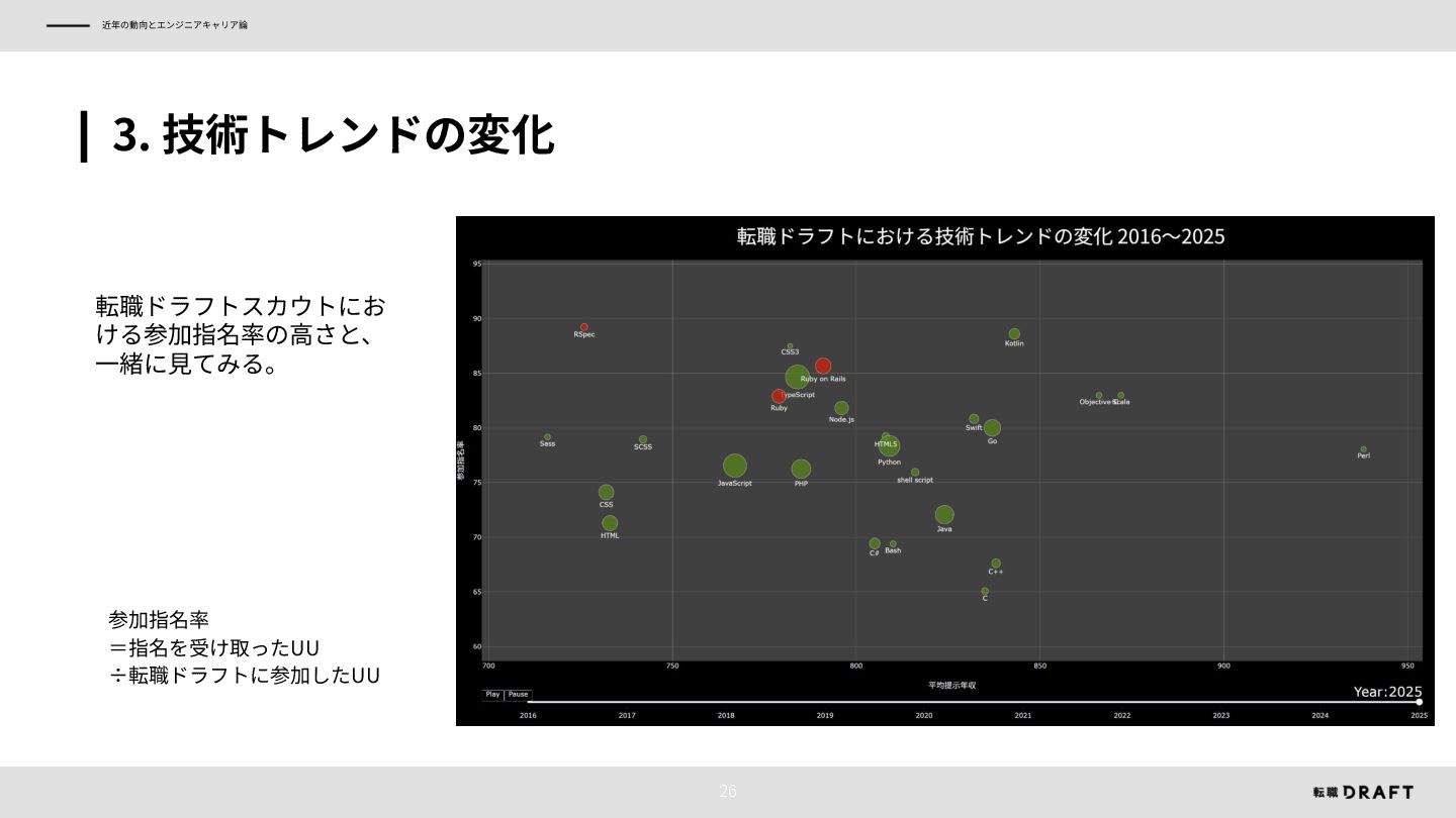 26 3. 技術トレンドの変化 転職ドラフトスカウトにお ける参加指名率の⾼さと、 ⼀緒に⾒てみる。 参加指名率 =指名を受け取ったUU ÷転職ドラフトに参加したUU 近年の動向とエンジニアキャリア論