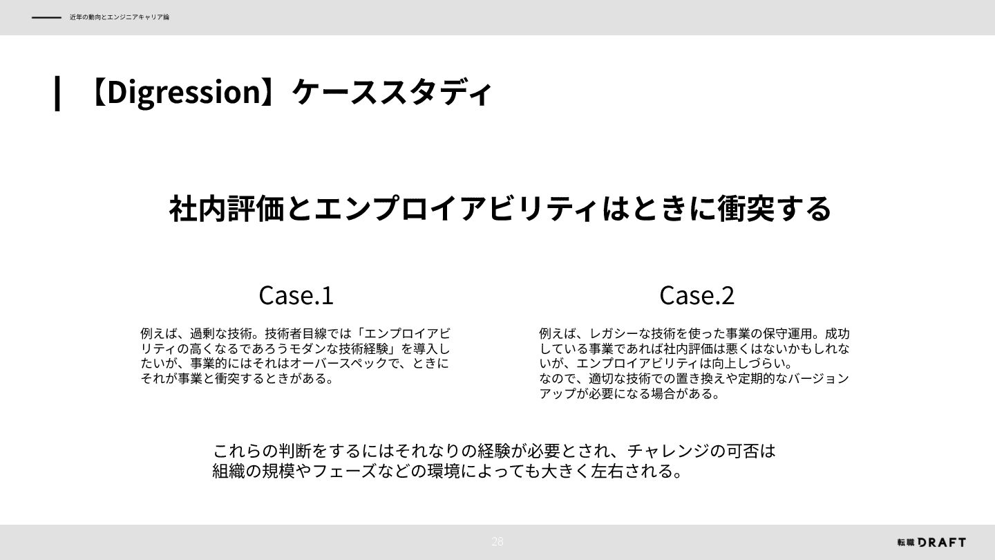 なので、適切な技術での置き換えや定期的なバージョン アップが必要になる場合がある。 Case.1 Case.2 これらの判断をするにはそれなりの経験が必要とされ、チャレンジの可否は 組織の規模やフェーズなどの環境によっても⼤きく左右される。 近年の動向とエンジニアキャリア論