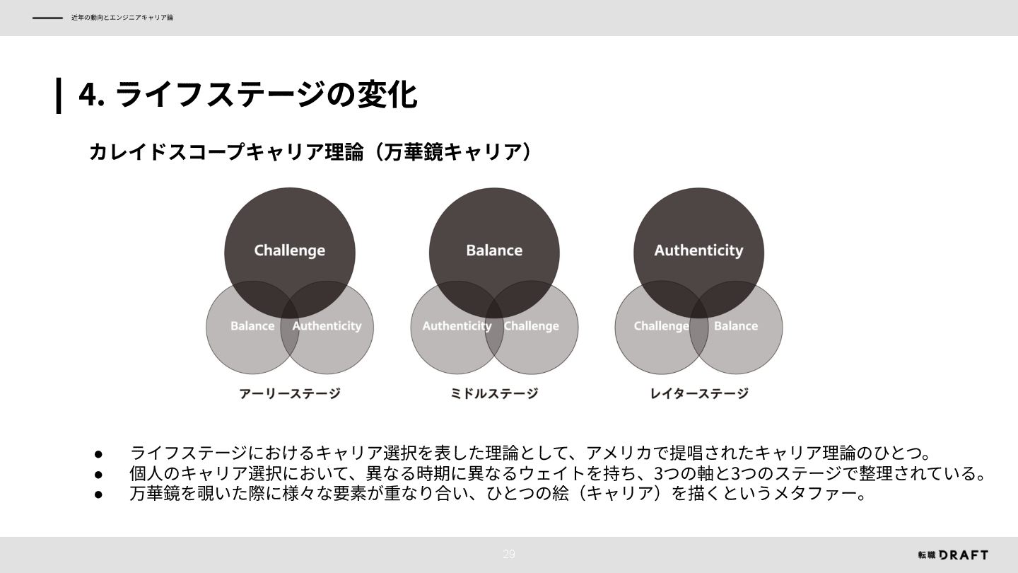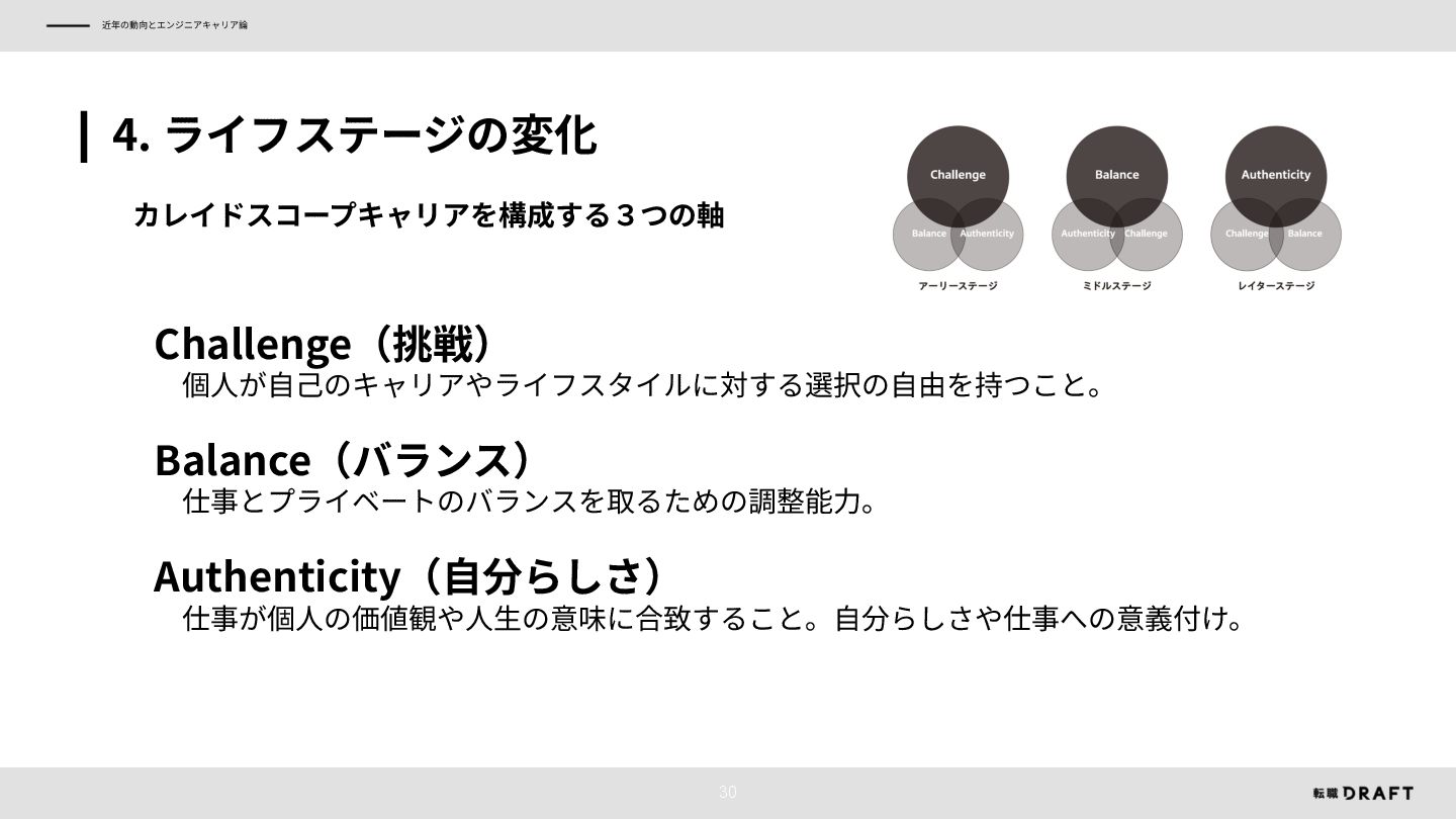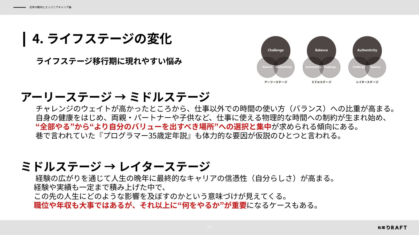 → レイターステージ 経験の広がりを通じて⼈⽣の晩年に最終的なキャリアの信憑性(⾃分らしさ)が⾼まる。 経験や実績も⼀定まで積み上げた中で、 この先の⼈⽣にどのような影響を及ぼすのかという意味づけが⾒えてくる。 職位や年収も⼤事ではあるが、それ以上に“何をやるか”が重要になるケースもある。 4. ライフステージの変化 近年の動向とエンジニアキャリア論