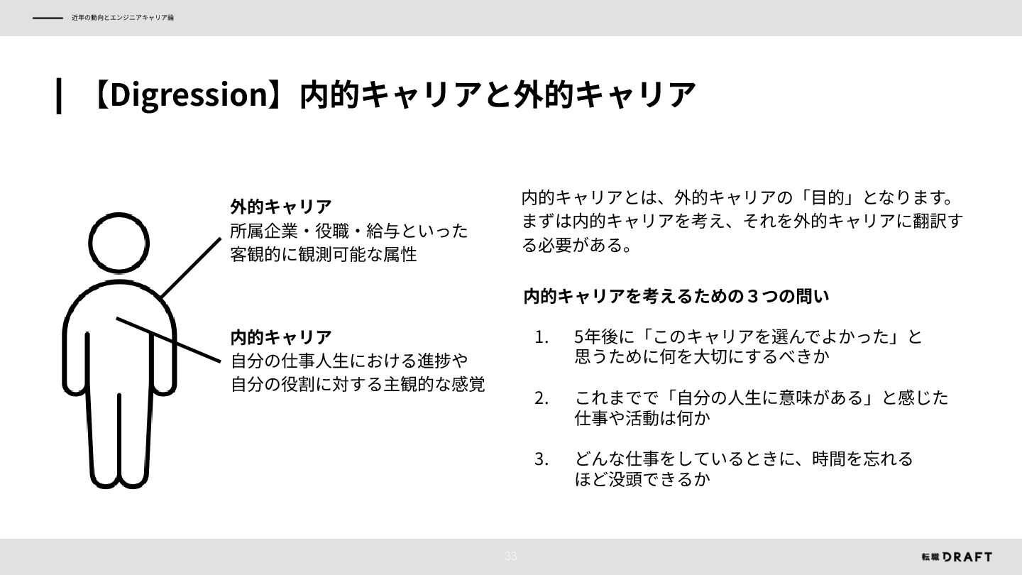 どんな仕事をしているときに、時間を忘れる ほど没頭できるか 外的キャリア 所属企業‧役職‧給与といった 客観的に観測可能な属性 内的キャリア ⾃分の仕事⼈⽣における進捗や ⾃分の役割に対する主観的な感覚 内的キャリアとは、外的キャリアの「⽬的」となります。 まずは内的キャリアを考え、それを外的キャリアに翻訳す る必要がある。 近年の動向とエンジニアキャリア論