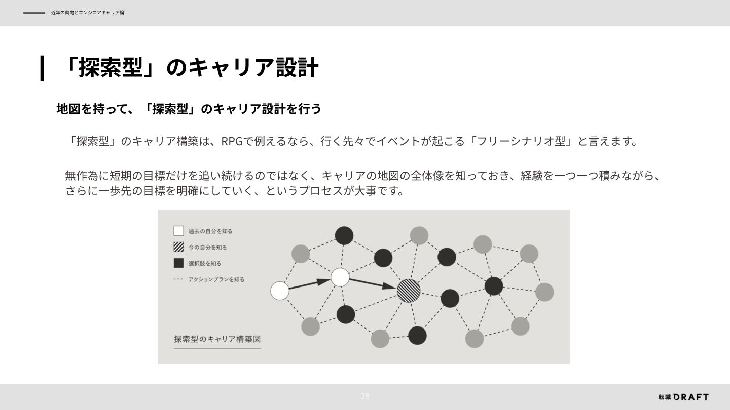 35 「逆算型」のキャリア設計の難しさ 「探索型」のキャリア設計 これまで⼀般的とされてきた「逆算型」のキャリア構築は、 RPGで例えるなら、ひとつひとつミッションをクリアしてい く「クエスト型」と⾔えます。 やるべきことを絞ることで、ゴールに向かって着実に進んで いる実感を得られます。⼀⽅で、⻑期で定めたゴールが不変 であることが前提のため、外的環境や、求められるスキル‧ 技術‧役割などが⽬覚ましく変化するITエンジニアにとって