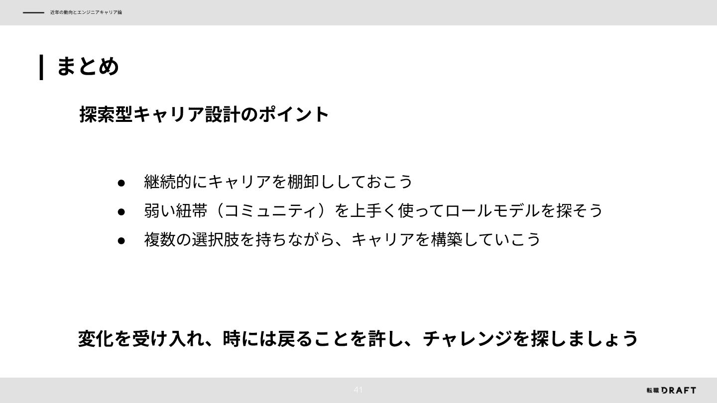 41 まとめ 変化を受け⼊れ、時には戻ることを許し、チャレンジを探しましょう • 継続的にキャリアを棚卸ししておこう • 弱い紐帯(コミュニティ)を上⼿く使ってロールモデルを探そう • 複数の選択肢を持ちながら、キャリアを構築していこう 探索型キャリア設計のポイント
