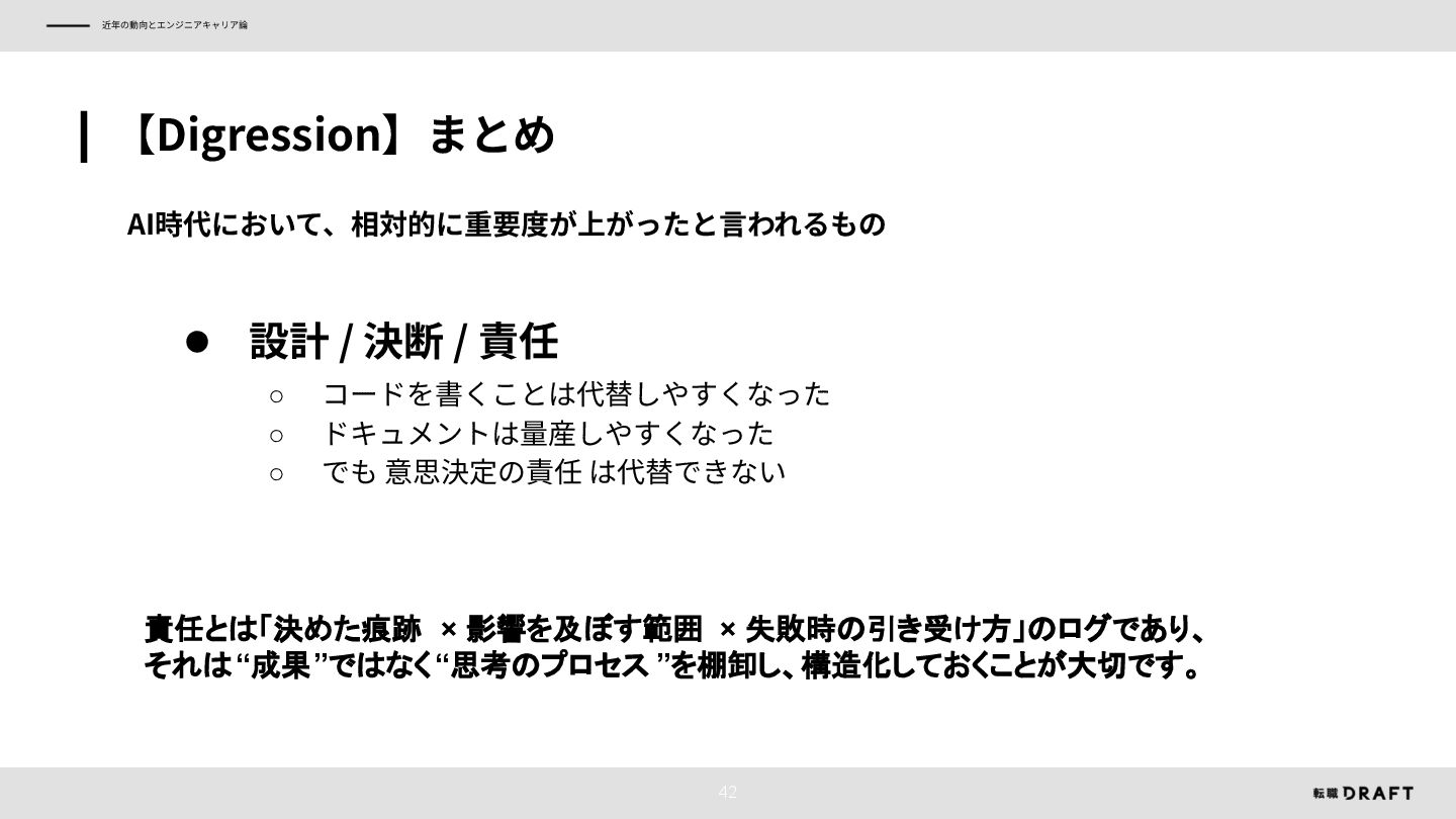 ◦ ドキュメントは量産しやすくなった ◦ でも 意思決定の責任 は代替できない 責任とは「決めた痕跡 × 影響を及ぼす範囲 × 失敗時の引き受け方」のログであり、 それは“成果”ではなく“思考のプロセス ”を棚卸し、構造化しておくことが大切です。 AI時代において、相対的に重要度が上がったと⾔われるもの 近年の動向とエンジニアキャリア論